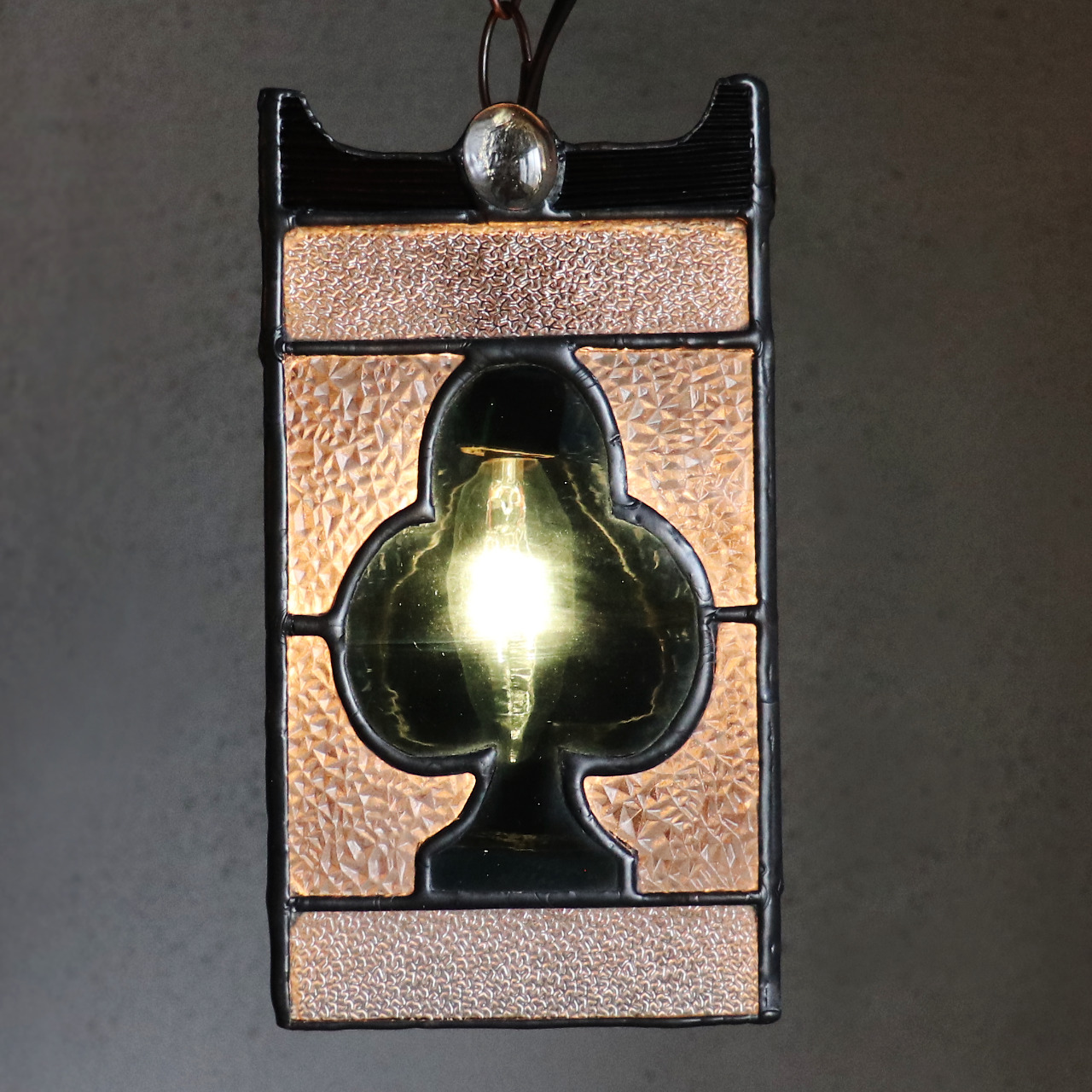 ヴィンテージガラスや色ガラスを使いトランプ柄が映えるステンドグラス製のペンダントライトを製作しました。