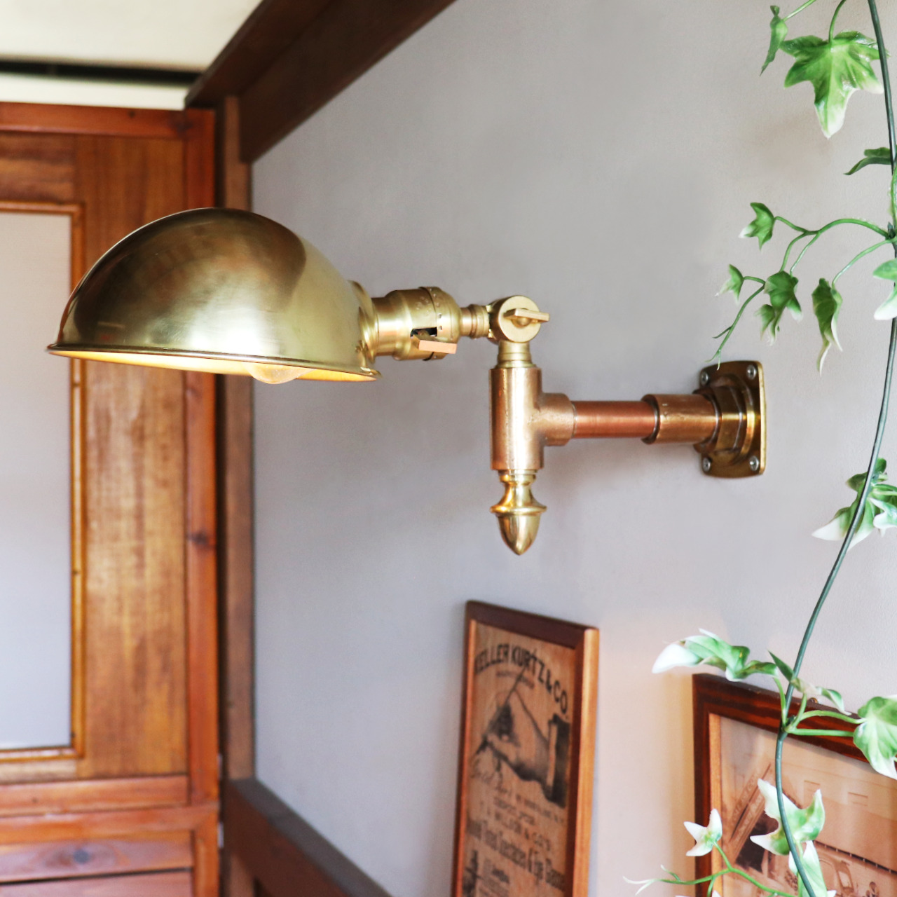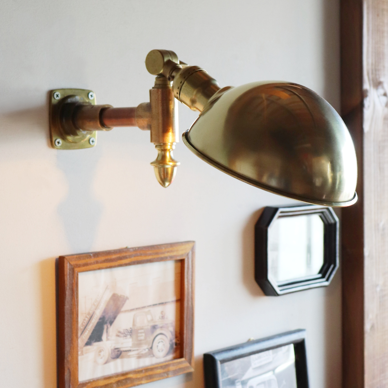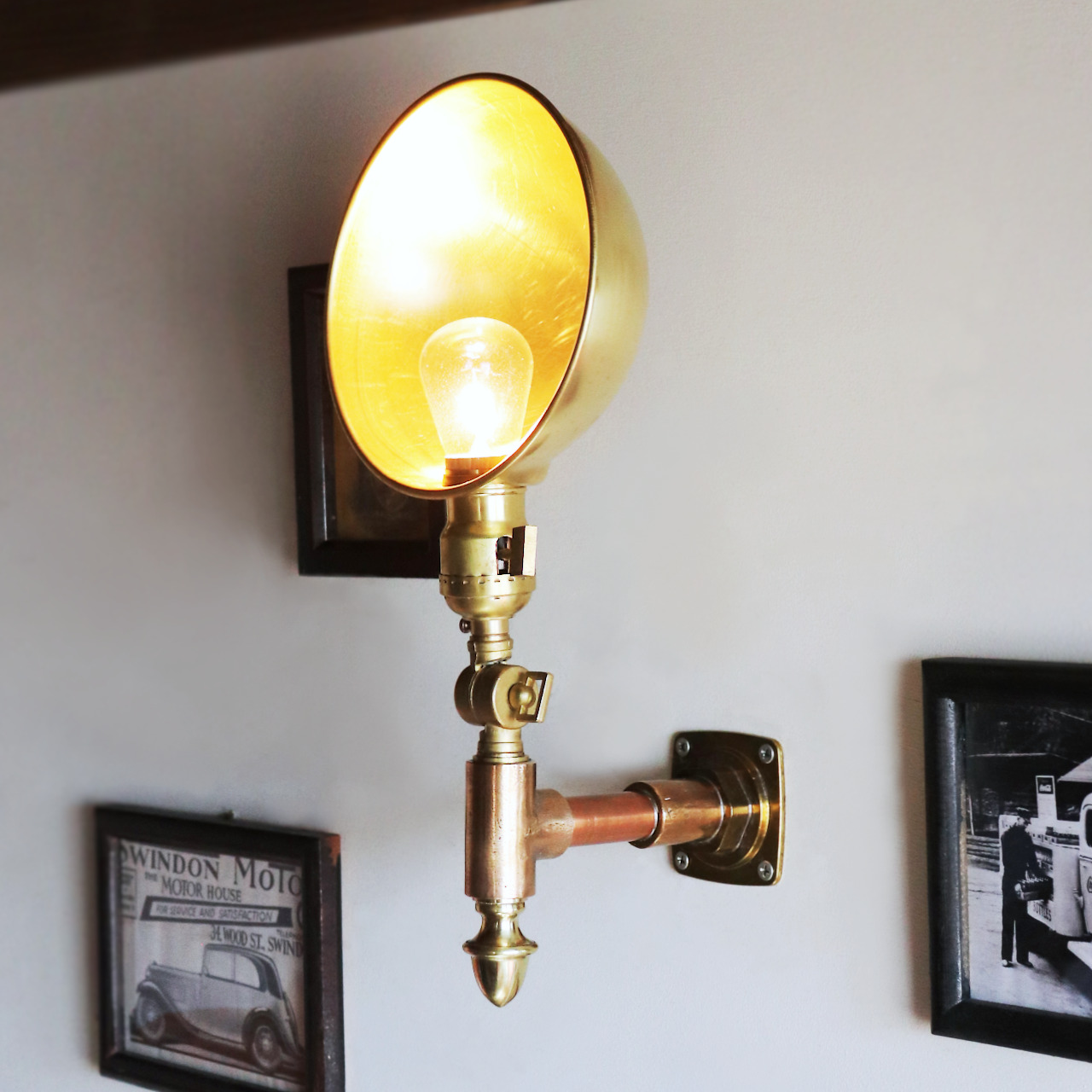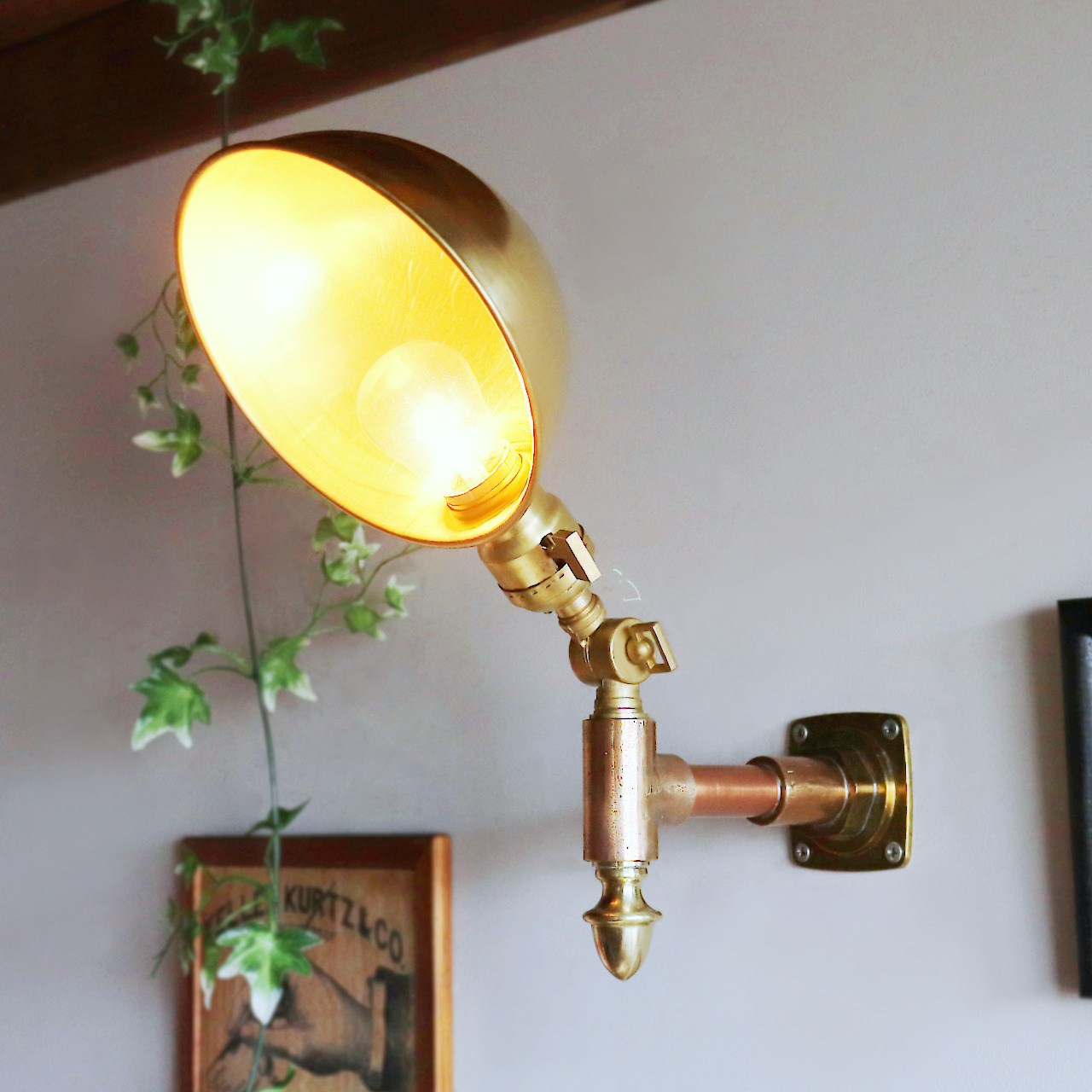 インダストリアル照明の定番とも言える丸みのあるラウンドシェードに、アンティークの真鍮ソケットや何十年も使い込まれたヴィンテージの水道管を合わせ存在感のあるブラケットライトに仕上げました。