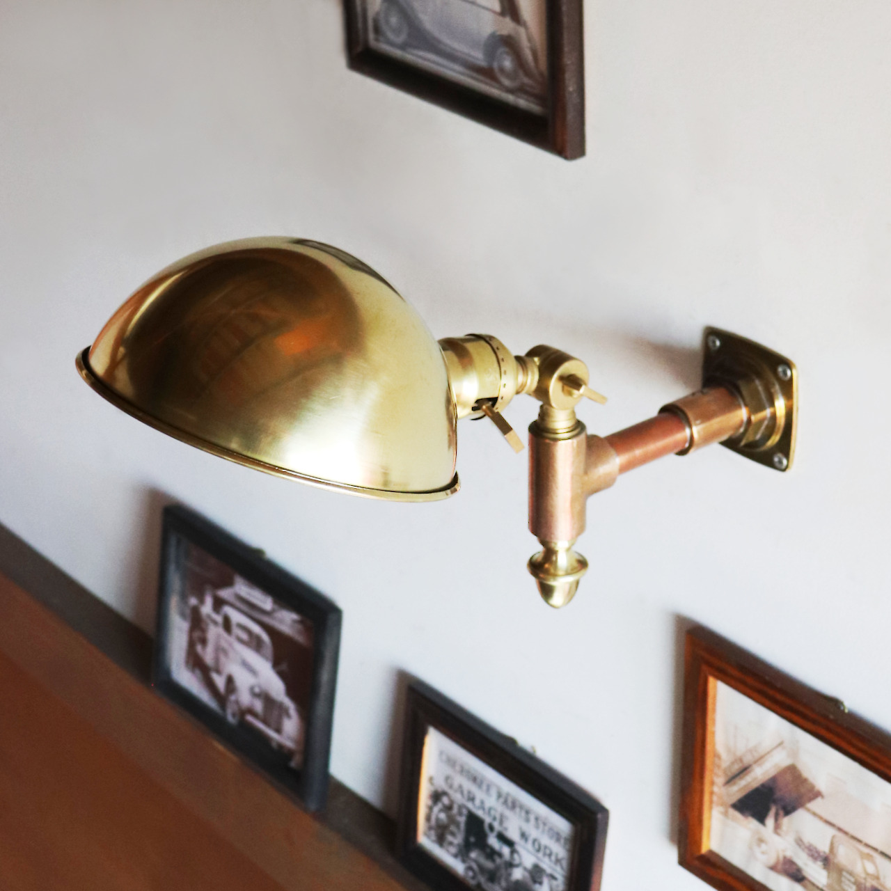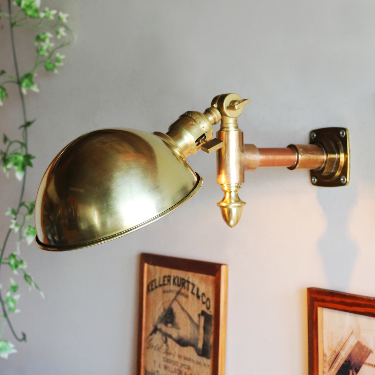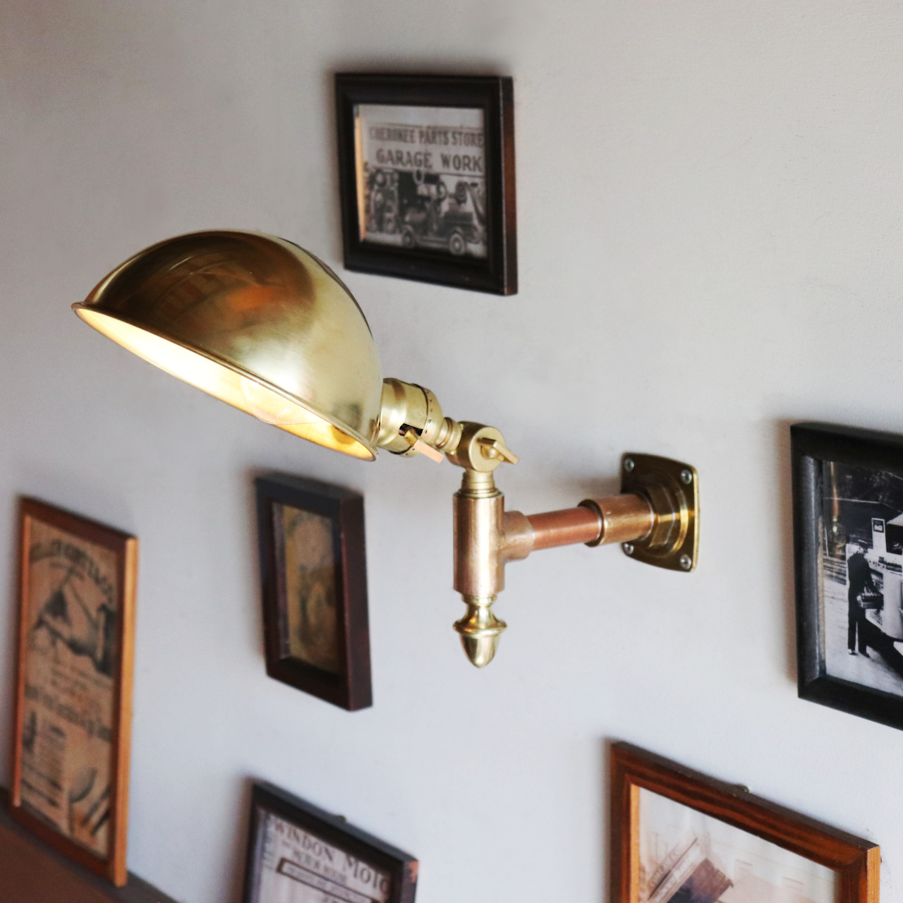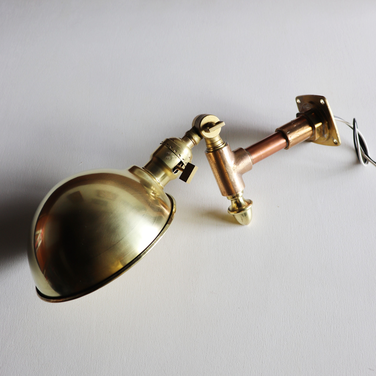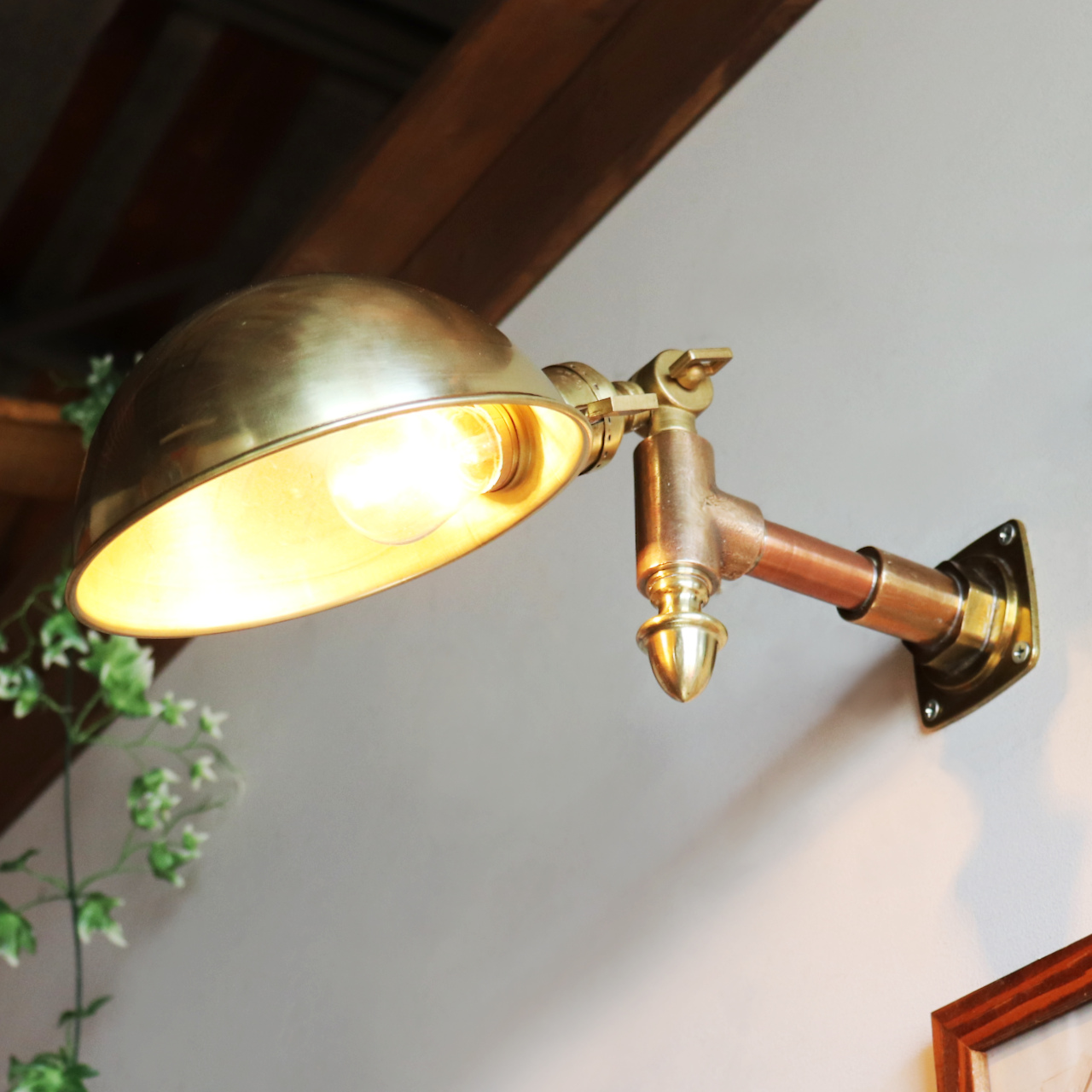 インダストリアル照明の定番とも言える丸みのあるラウンドシェードに、アンティークの真鍮ソケットや何十年も使い込まれたヴィンテージの水道管を合わせ存在感のあるブラケットライトに仕上げました。