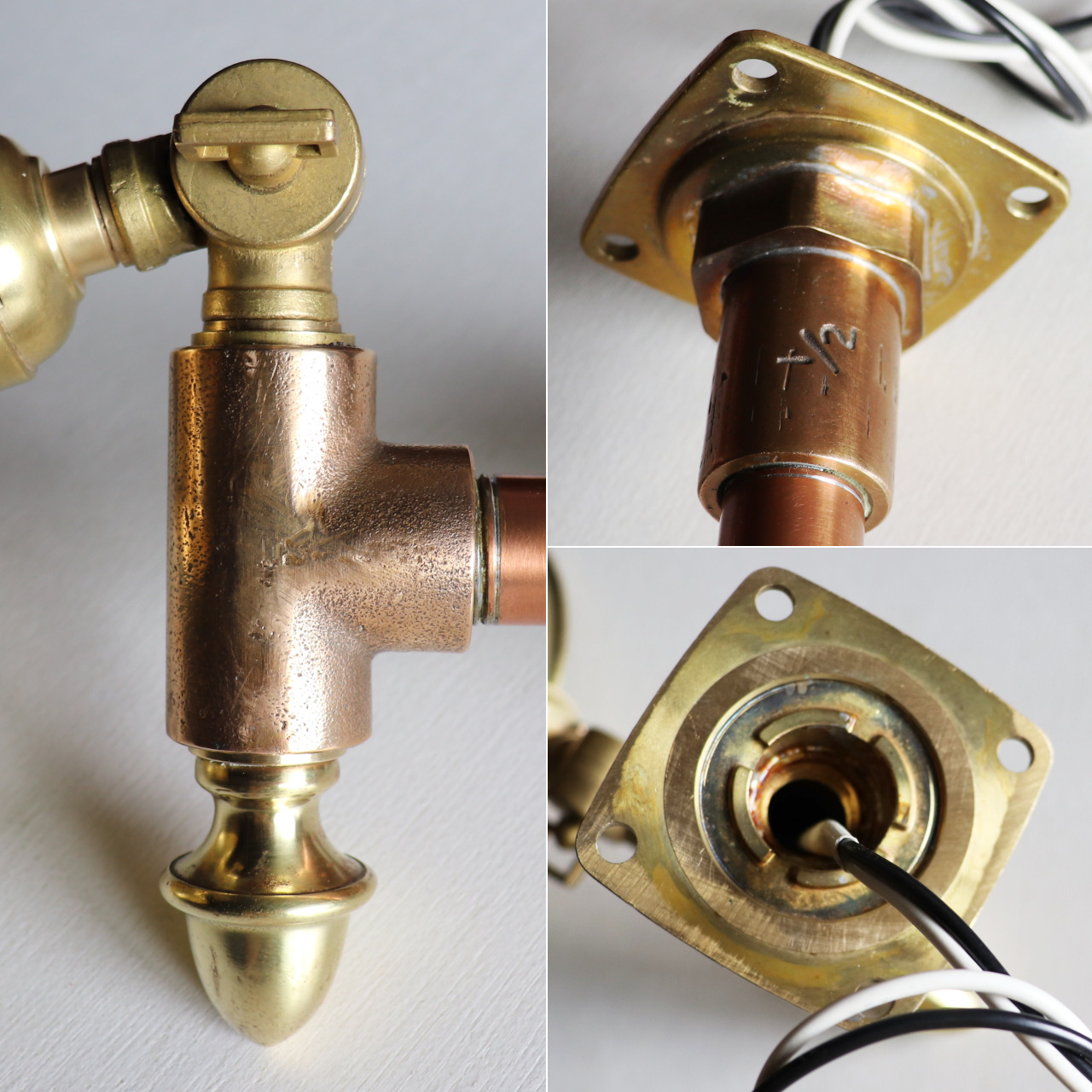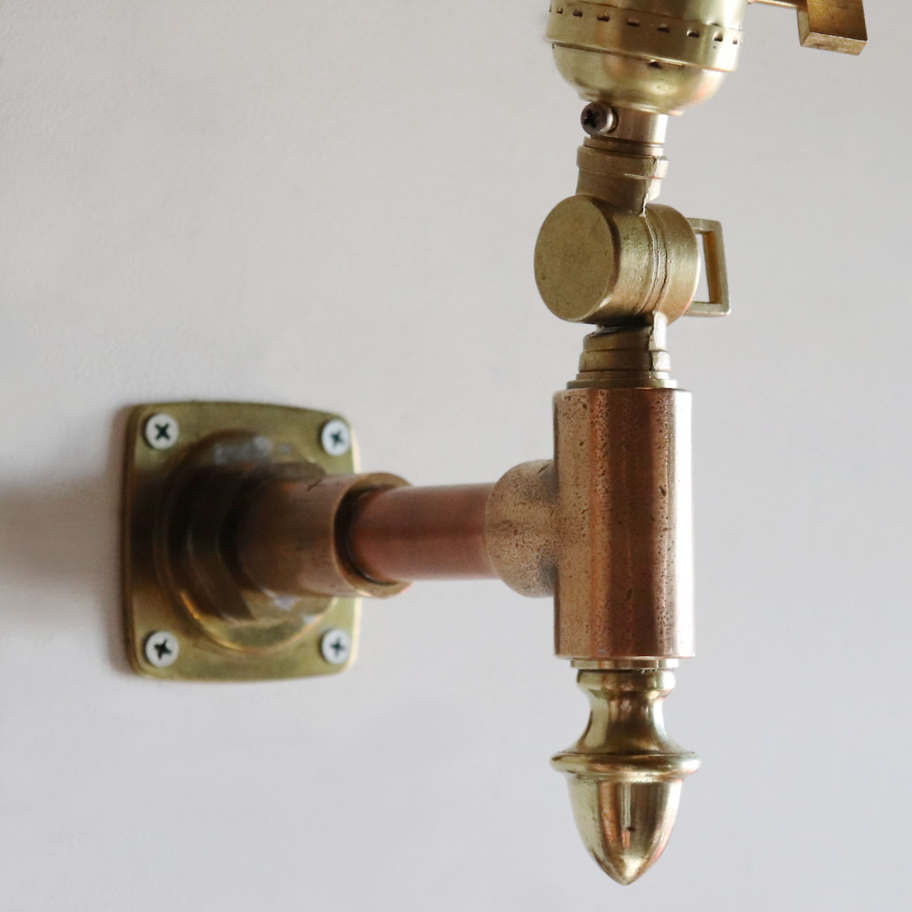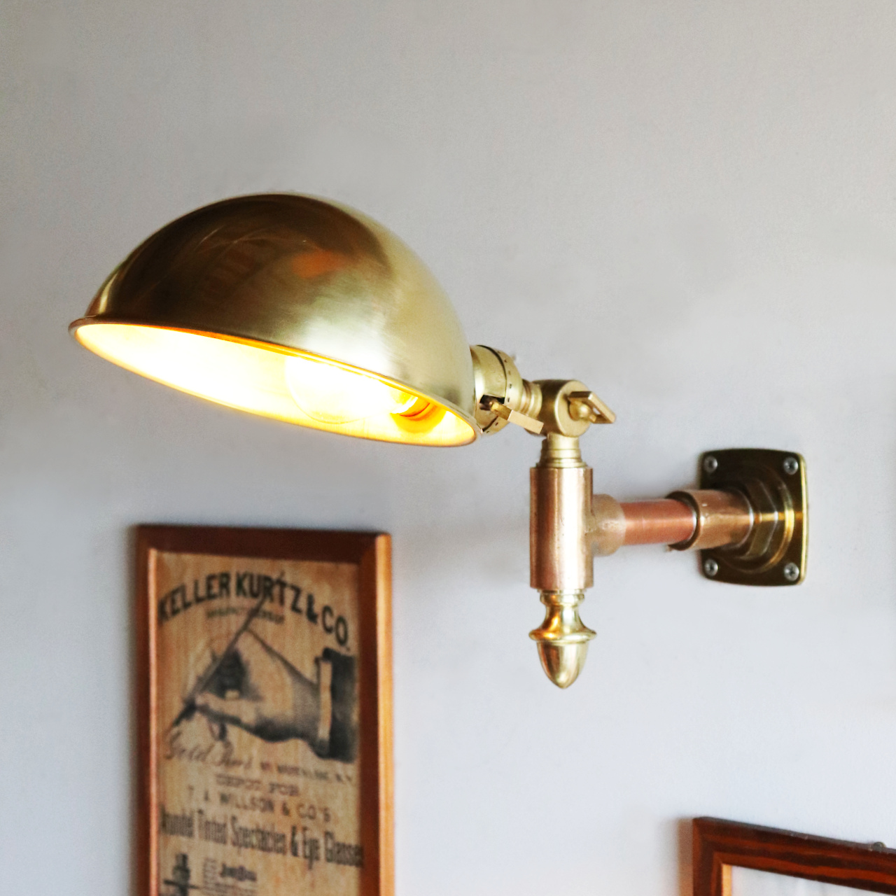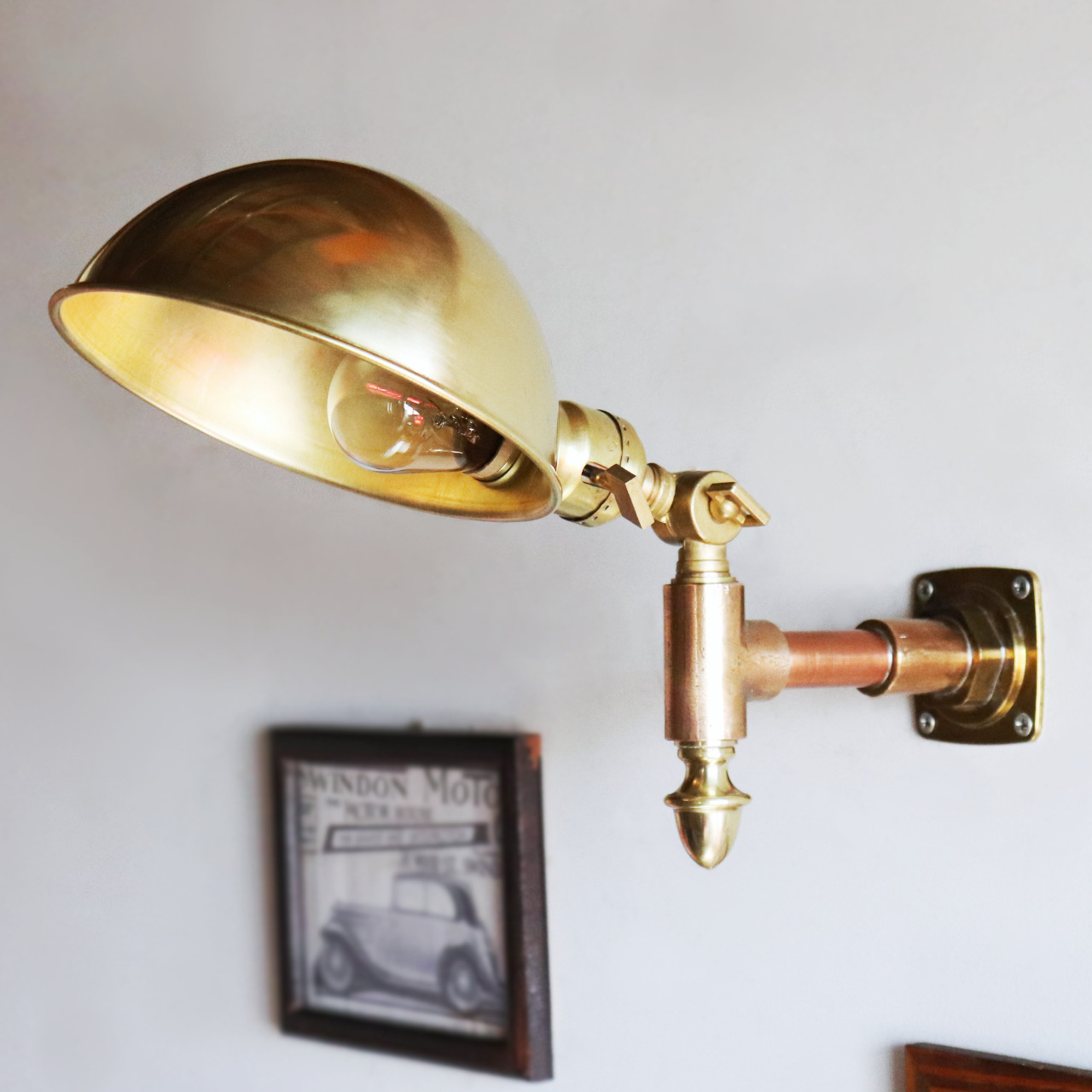 インダストリアル照明の定番とも言える丸みのあるラウンドシェードに、アンティークの真鍮ソケットや何十年も使い込まれたヴィンテージの水道管を合わせ存在感のあるブラケットライトに仕上げました。