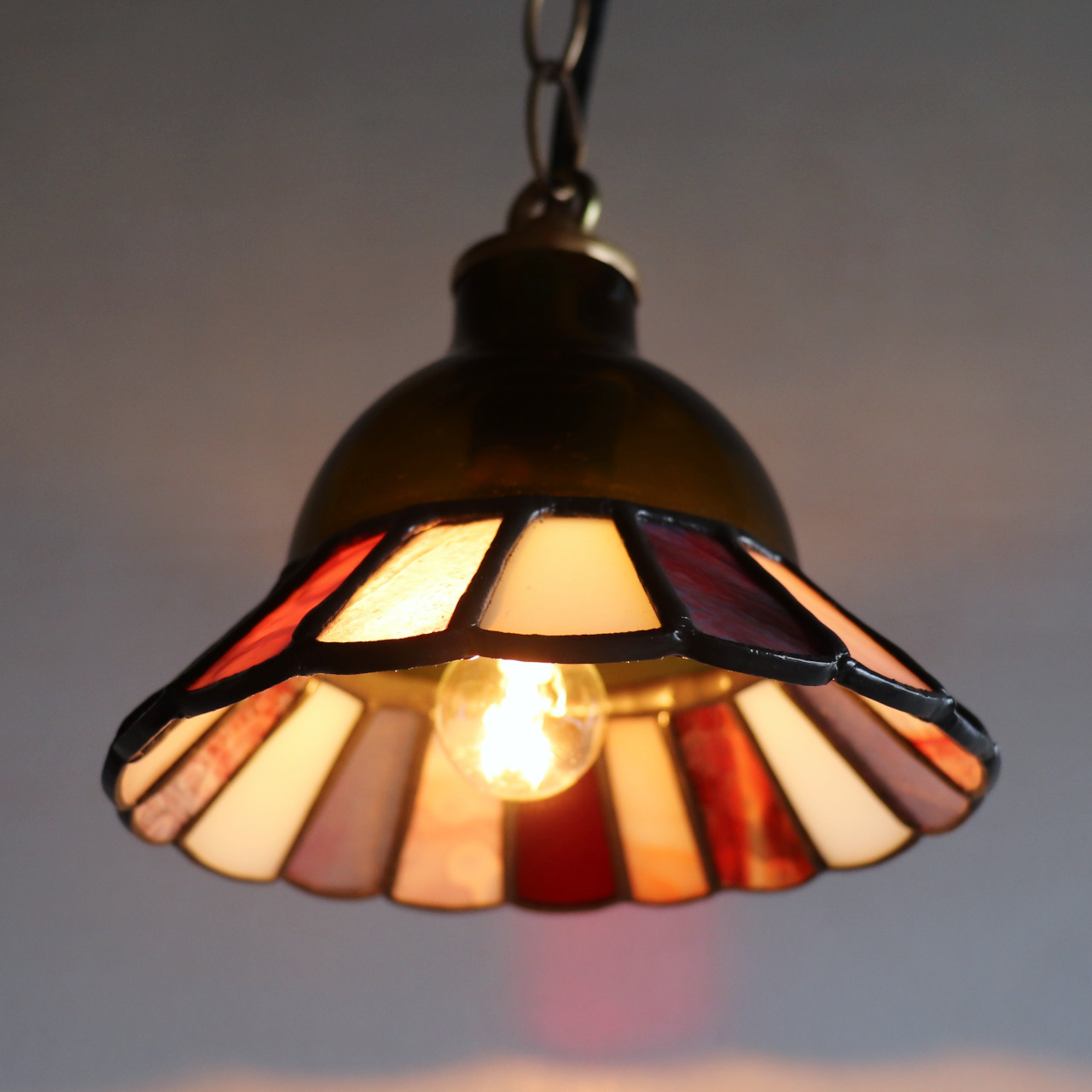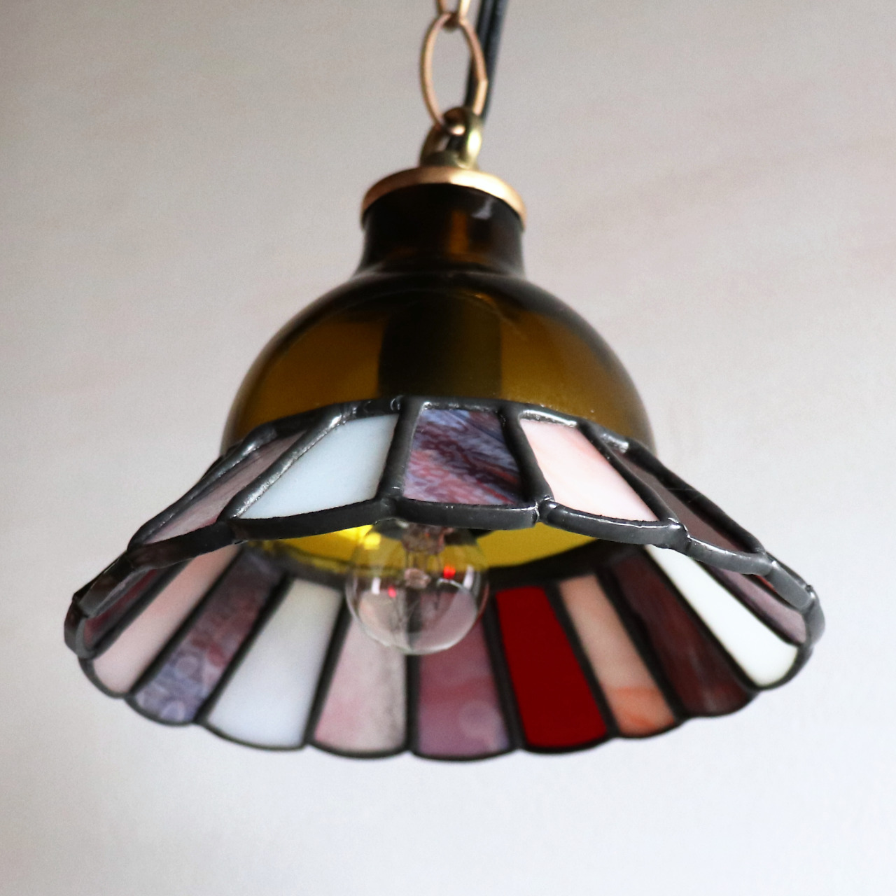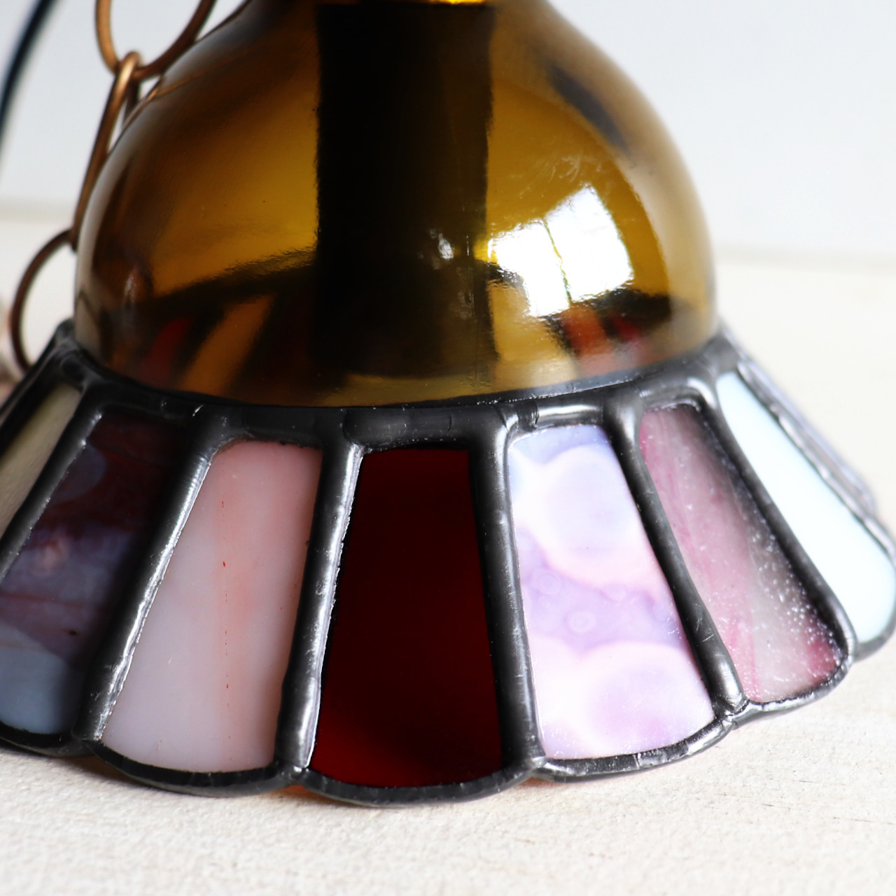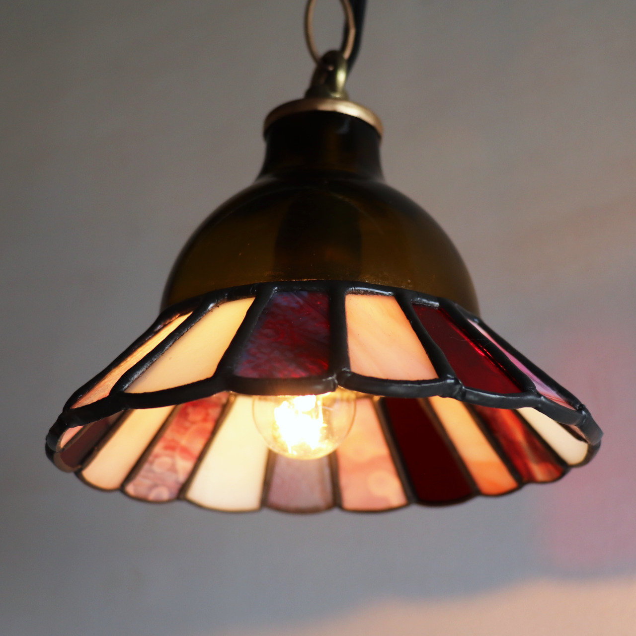 カットしたガラスピースを組み合わせてシェード(電傘)を作ることから、直線的なデザインになりがちなステンドグラス照明ですが、今回はドーム型のガラスと組み合わせてみました。