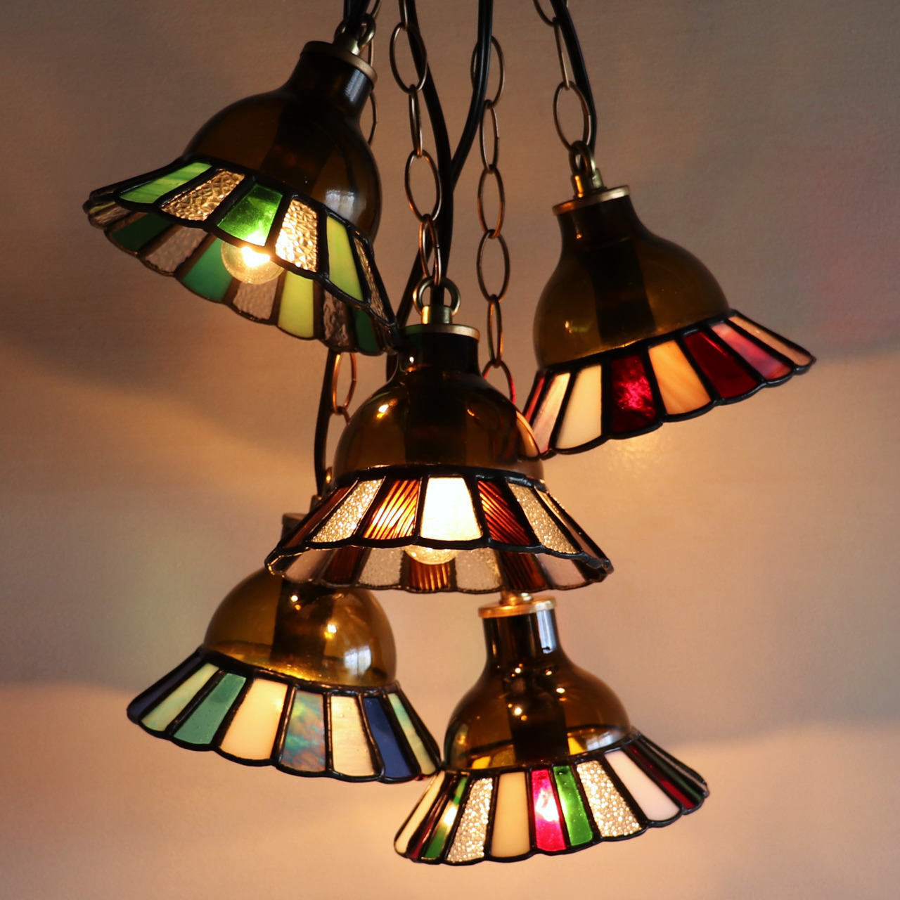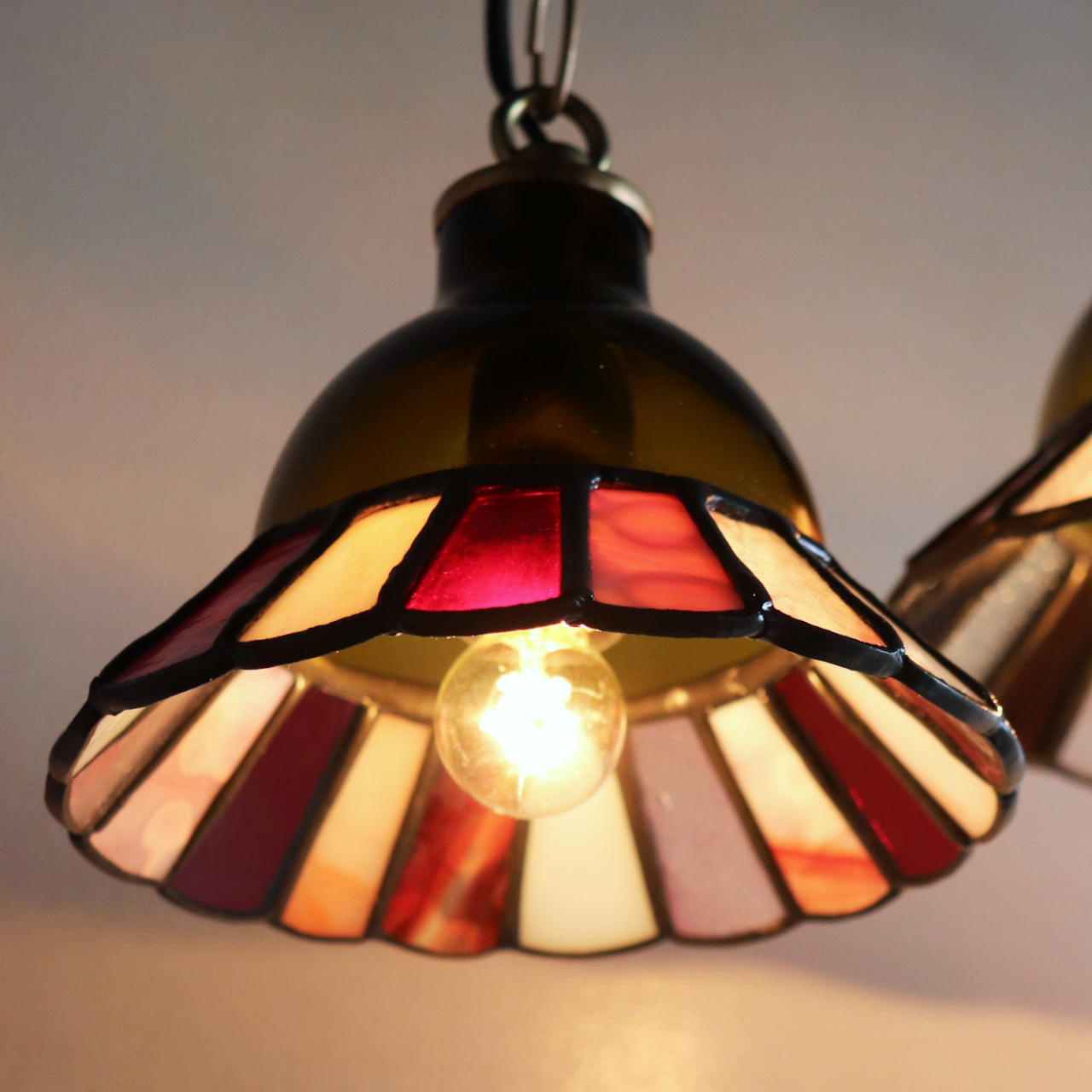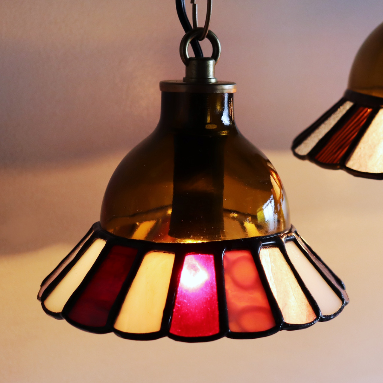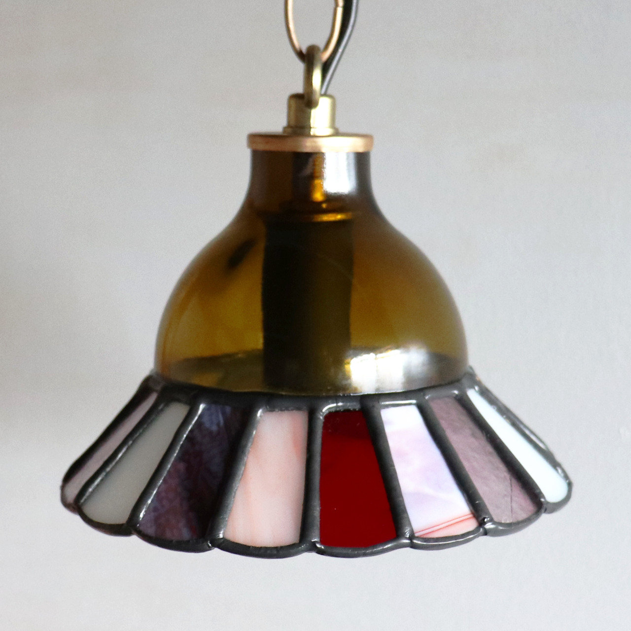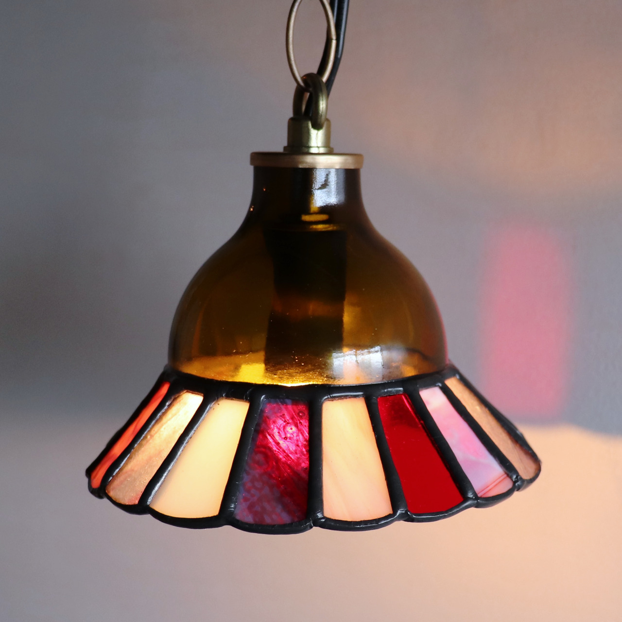 カットしたガラスピースを組み合わせてシェード(電傘)を作ることから、直線的なデザインになりがちなステンドグラス照明ですが、今回はドーム型のガラスと組み合わせてみました。