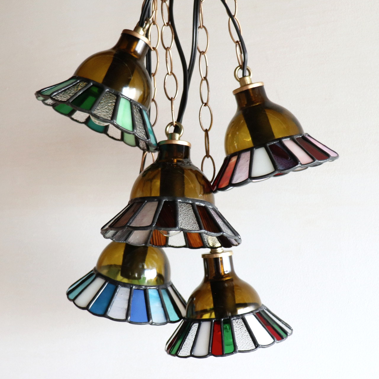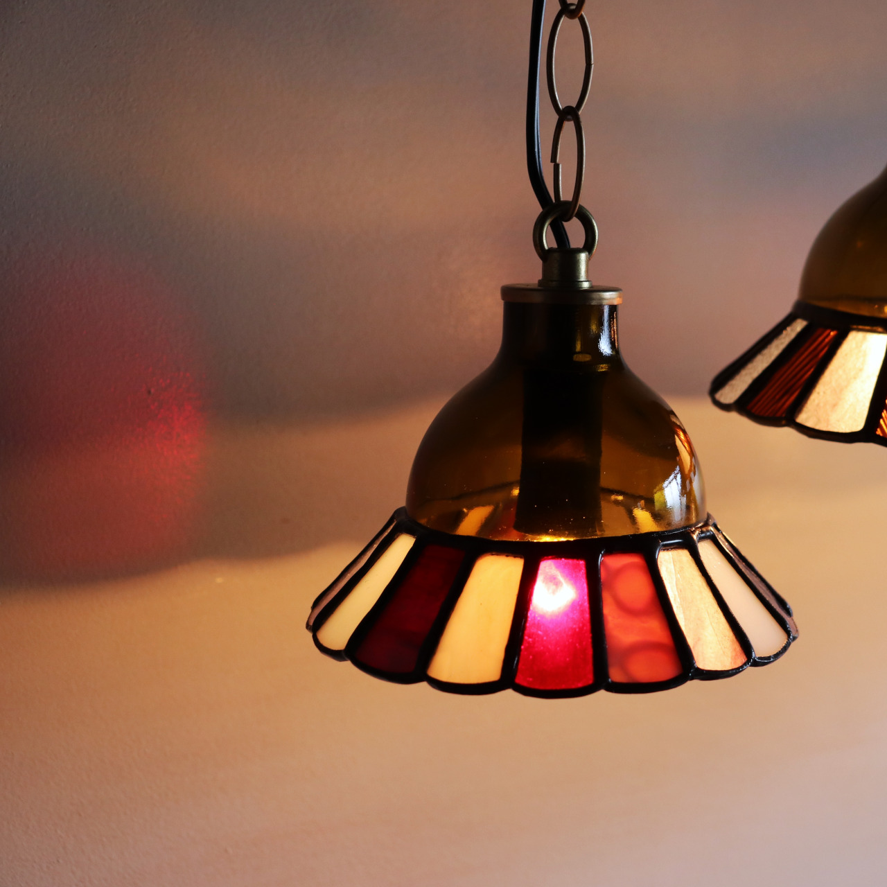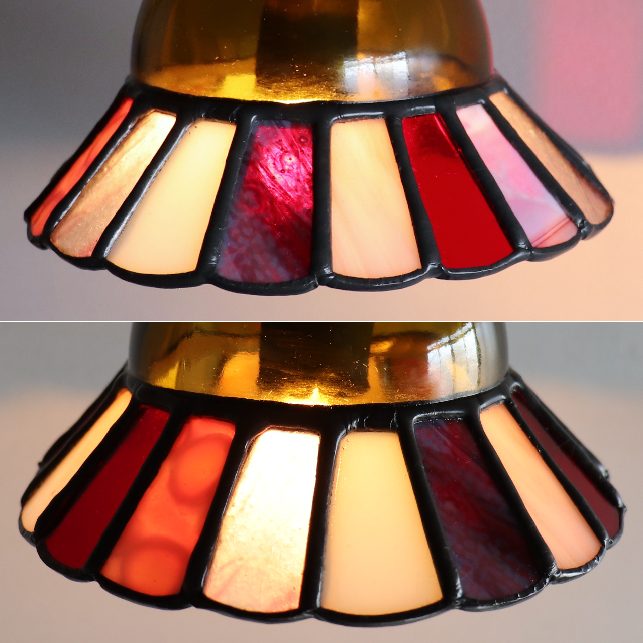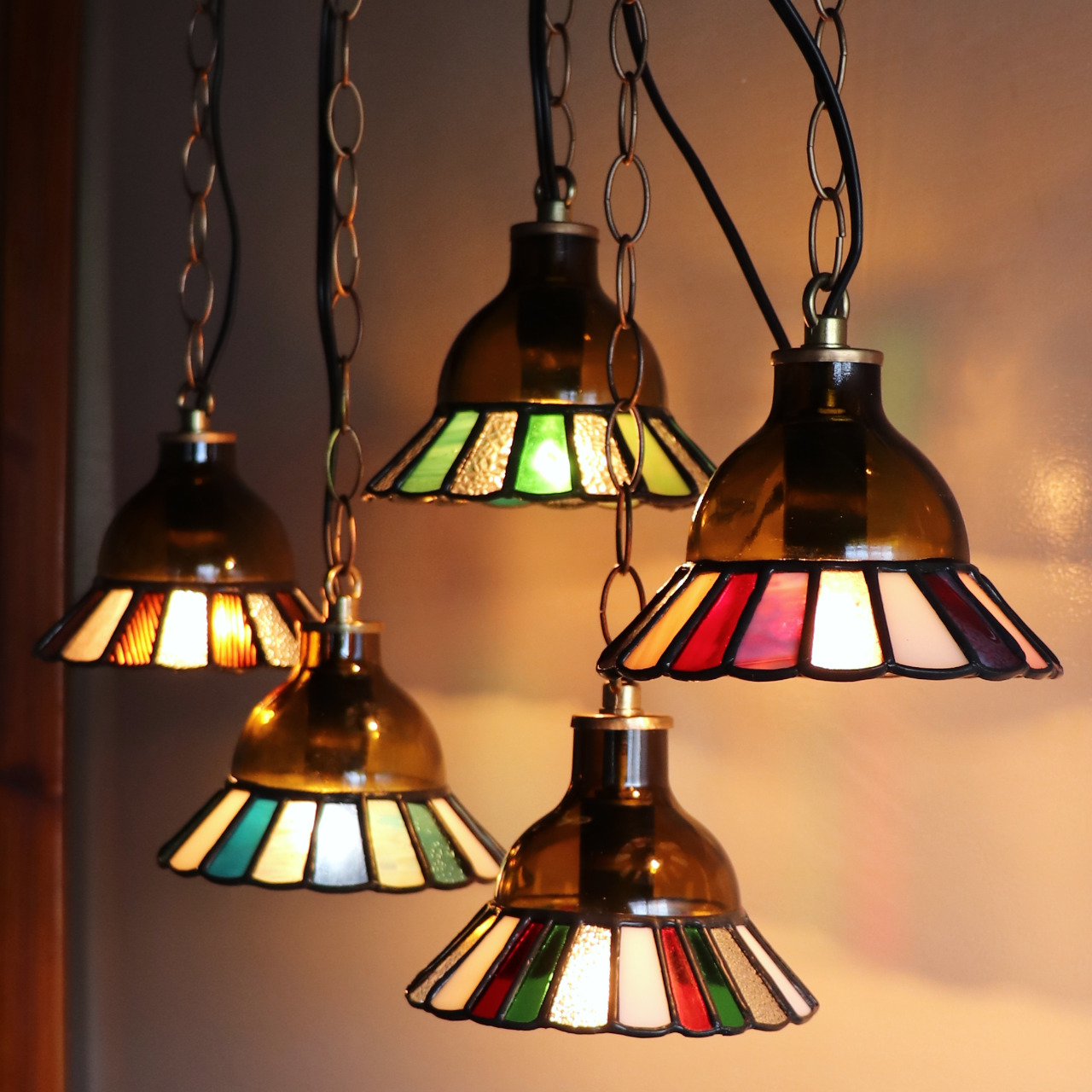 カットしたガラスピースを組み合わせてシェード(電傘)を作ることから、直線的なデザインになりがちなステンドグラス照明ですが、今回はドーム型のガラスと組み合わせてみました。