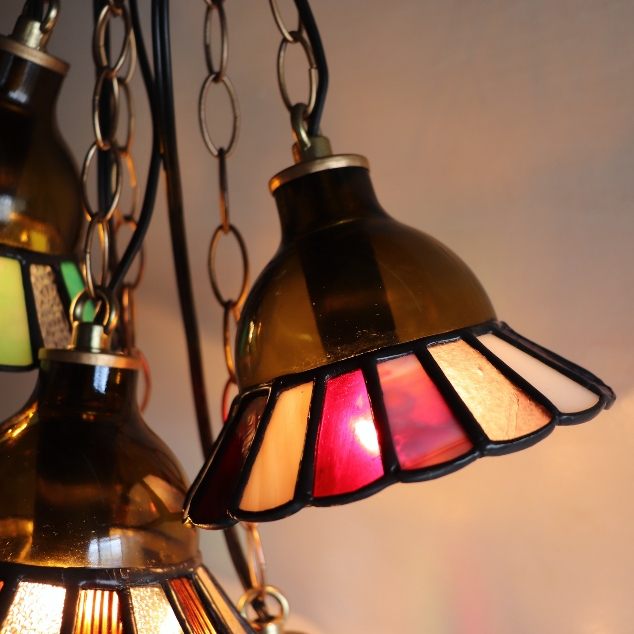 美しいマーブル模様の赤いガラスや可愛らしいピンク色のガラスを花びらのようにカットし、深いグリーンガラスのドーム先端に取り付けたことでお花のような可愛らしい形状に仕上がりました。