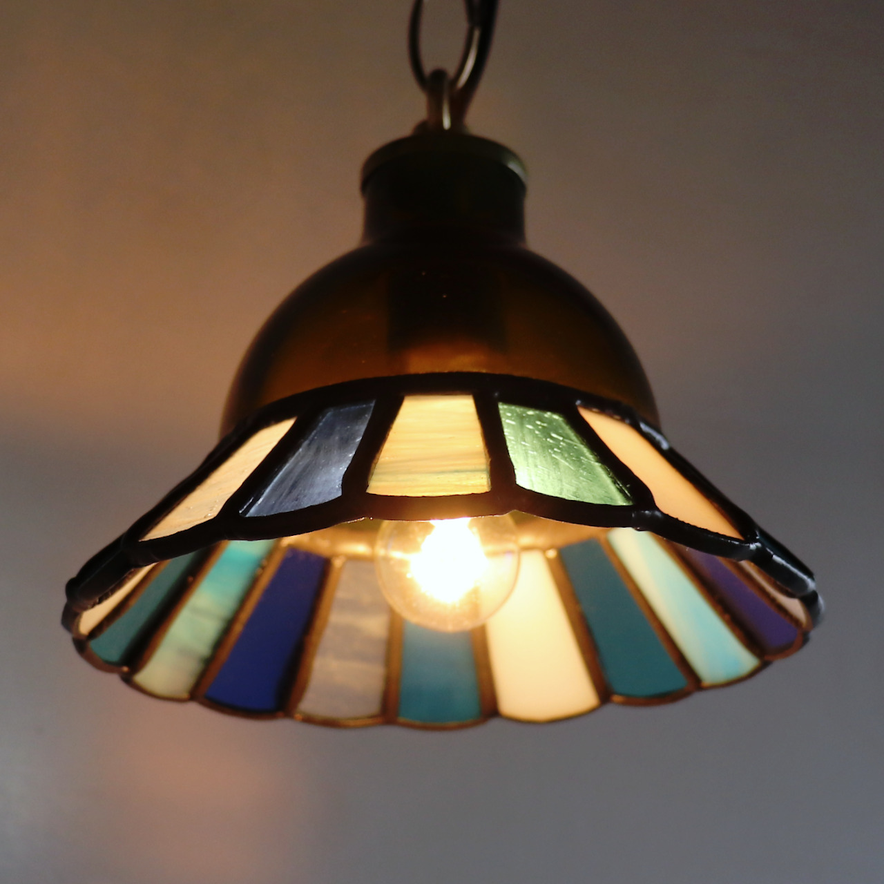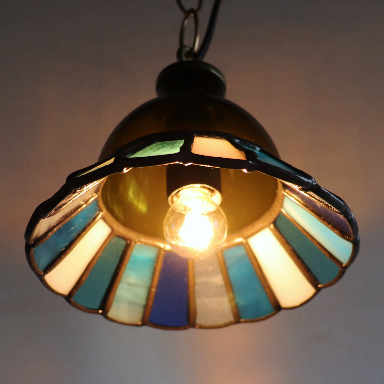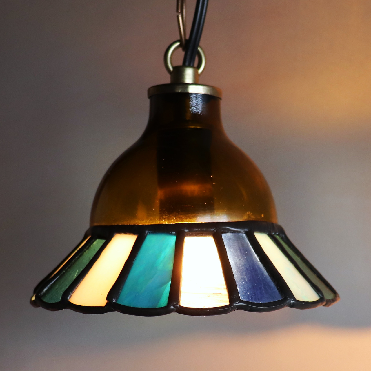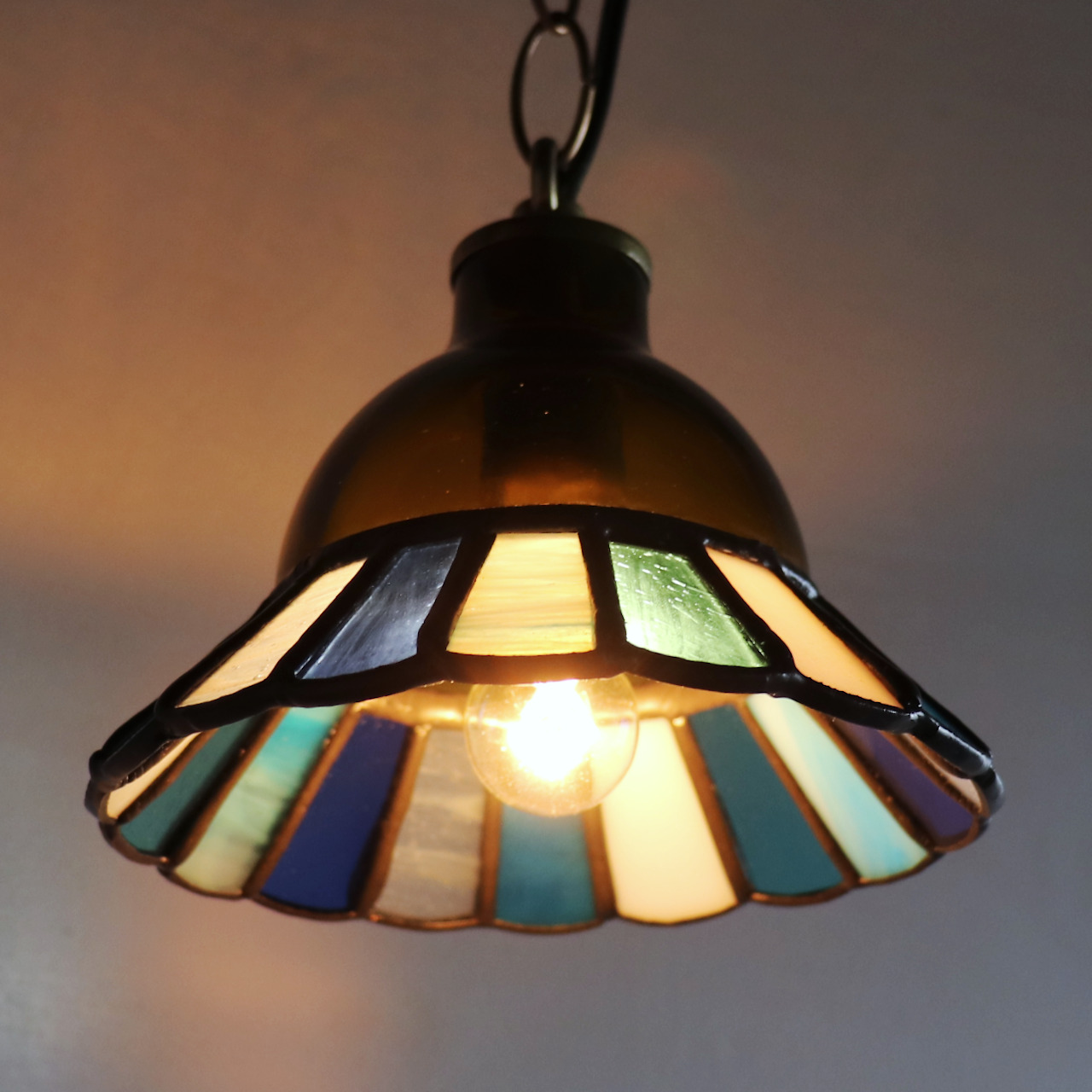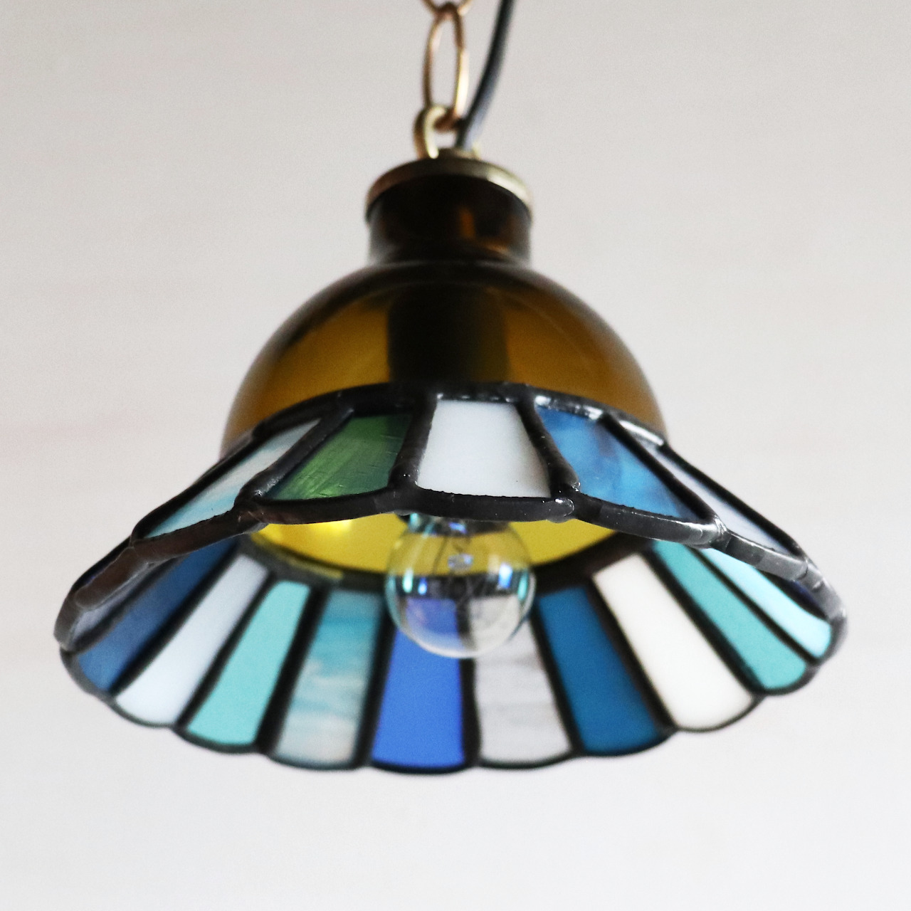 カットしたガラスピースを組み合わせてシェード(電傘)を作ることから、直線的なデザインになりがちなステンドグラス照明ですが、今回はドーム型のガラスと組み合わせてみました。