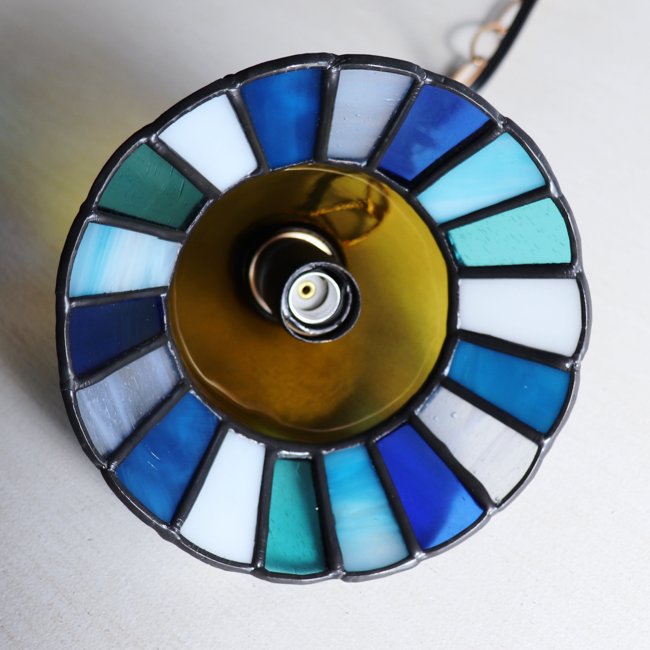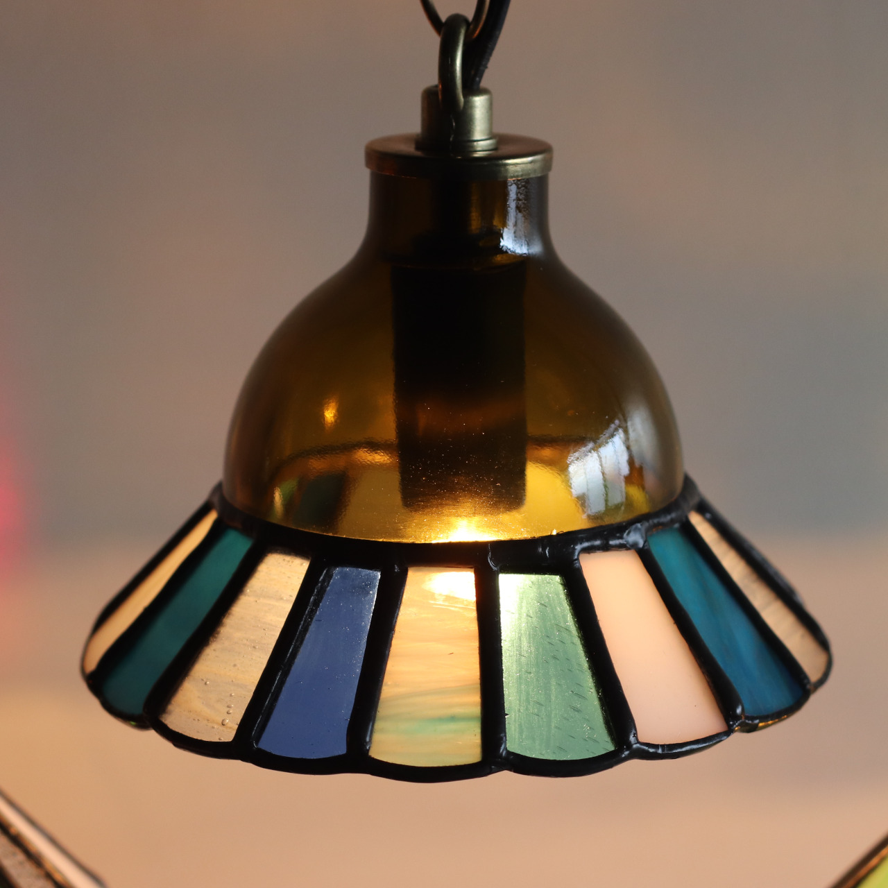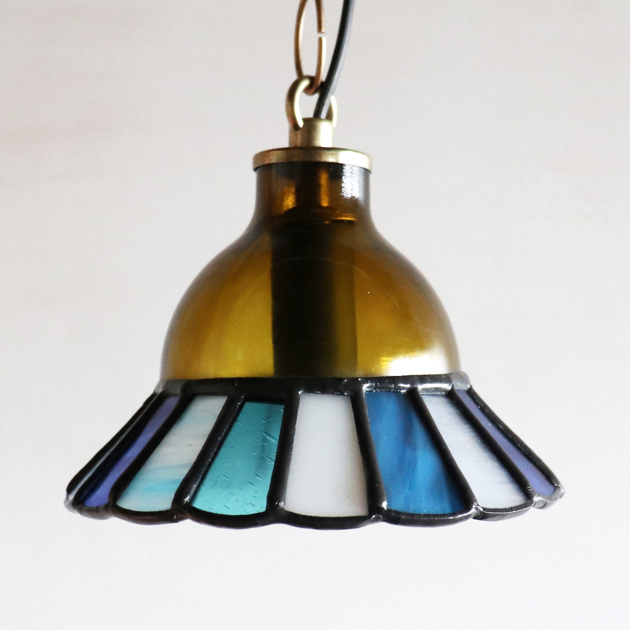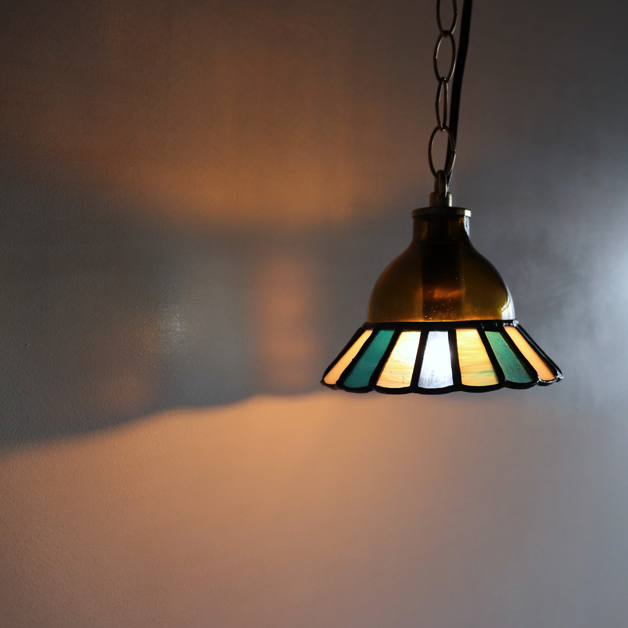 カットしたガラスピースを組み合わせてシェード(電傘)を作ることから、直線的なデザインになりがちなステンドグラス照明ですが、今回はドーム型のガラスと組み合わせてみました。