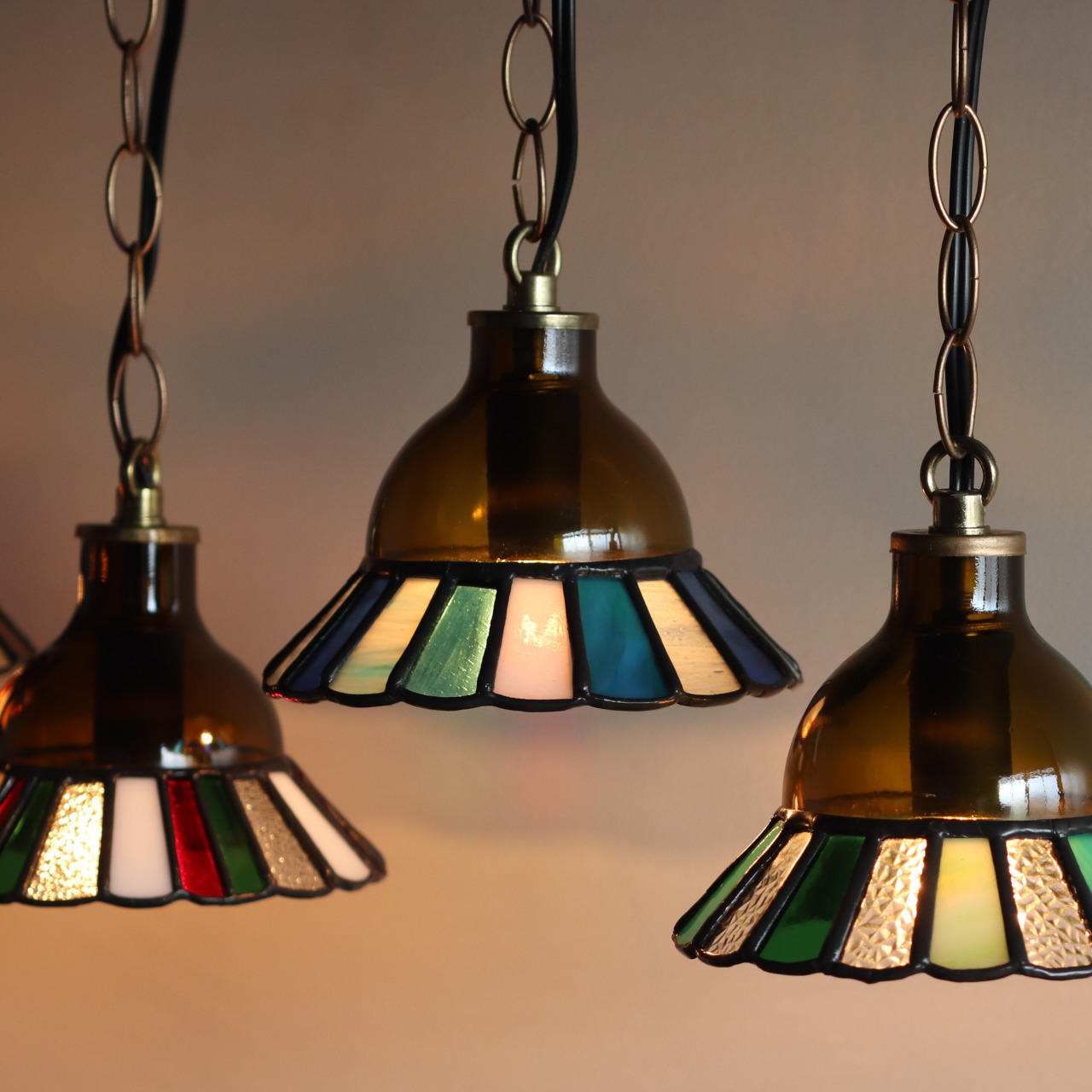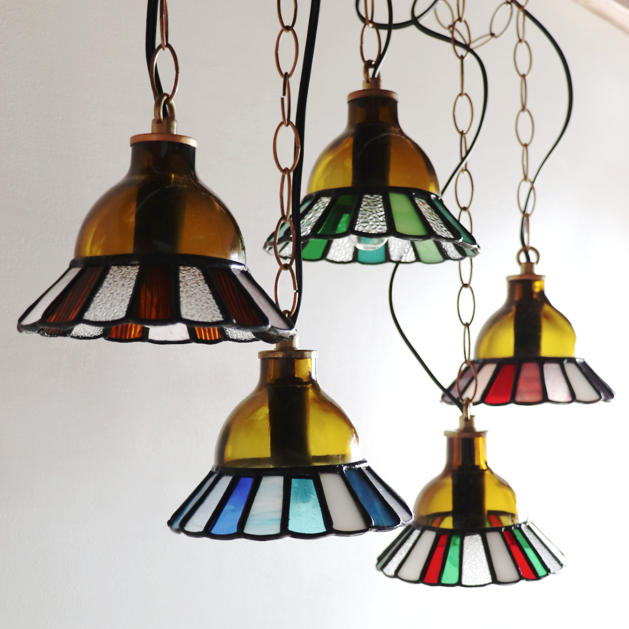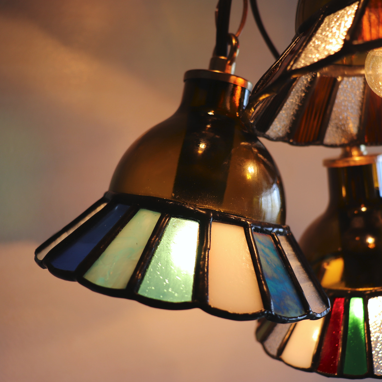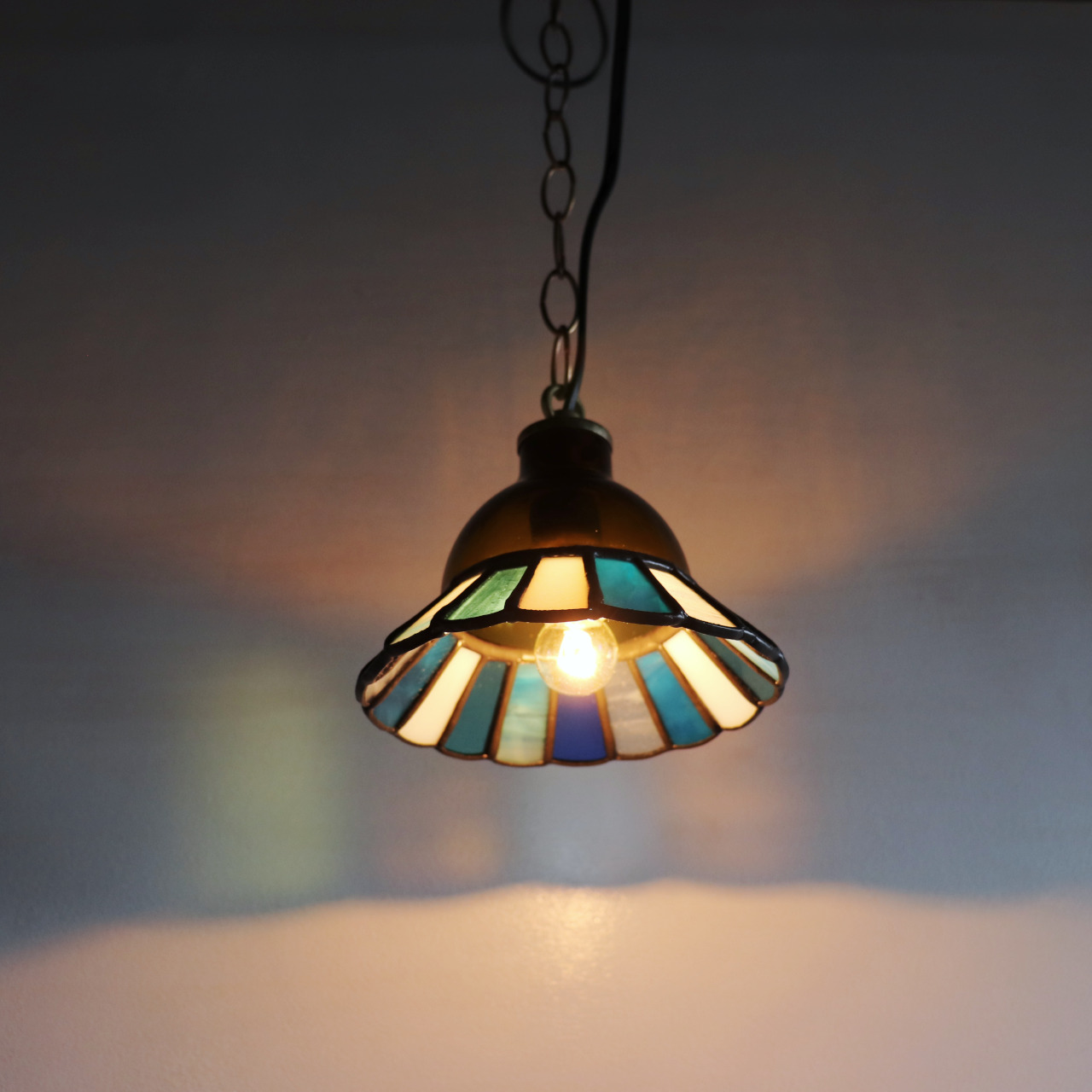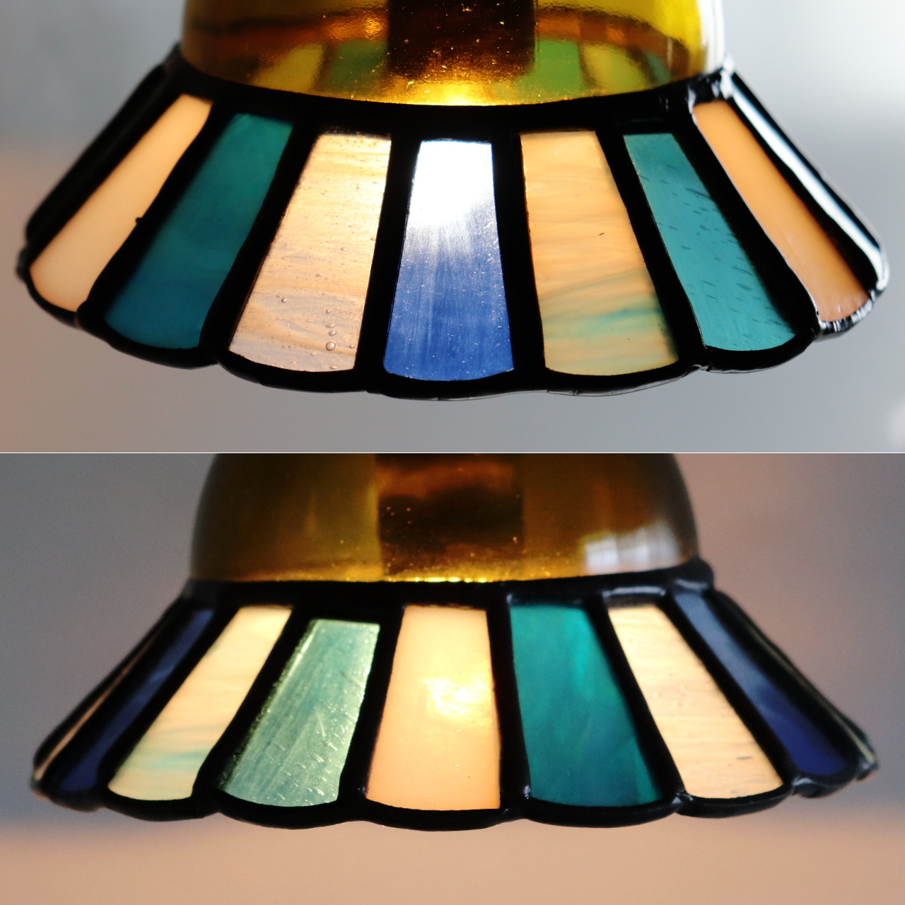 カットしたガラスピースを組み合わせてシェード(電傘)を作ることから、直線的なデザインになりがちなステンドグラス照明ですが、今回はドーム型のガラスと組み合わせてみました。