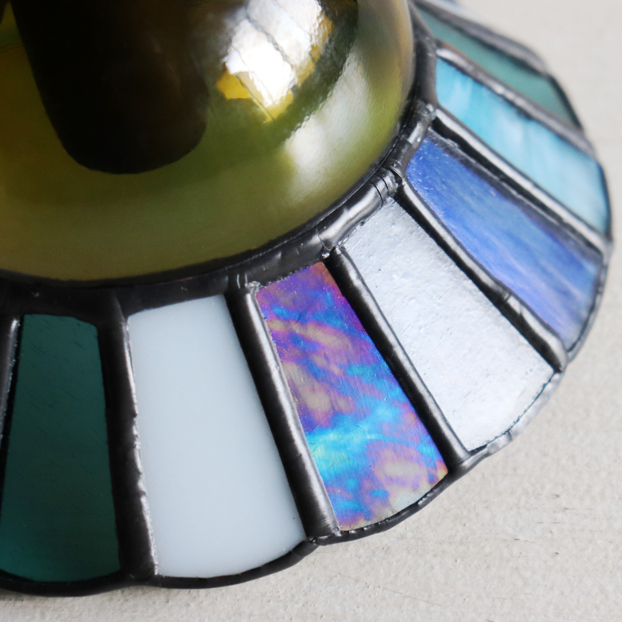 オーロラがかった美しいマーブル模様の青いガラスや可愛らしい水色のガラスを花びらのようにカットし、深いグリーンガラスのドーム先端に取り付けたことでお花のような可愛らしい形状に仕上がりました。