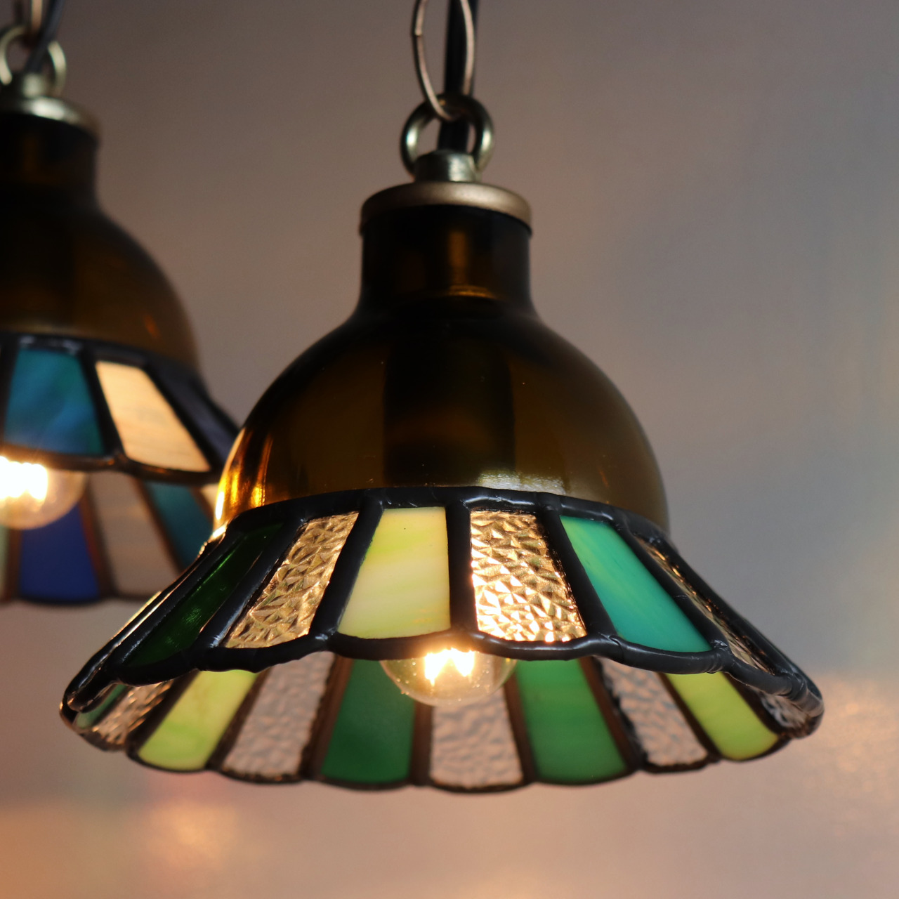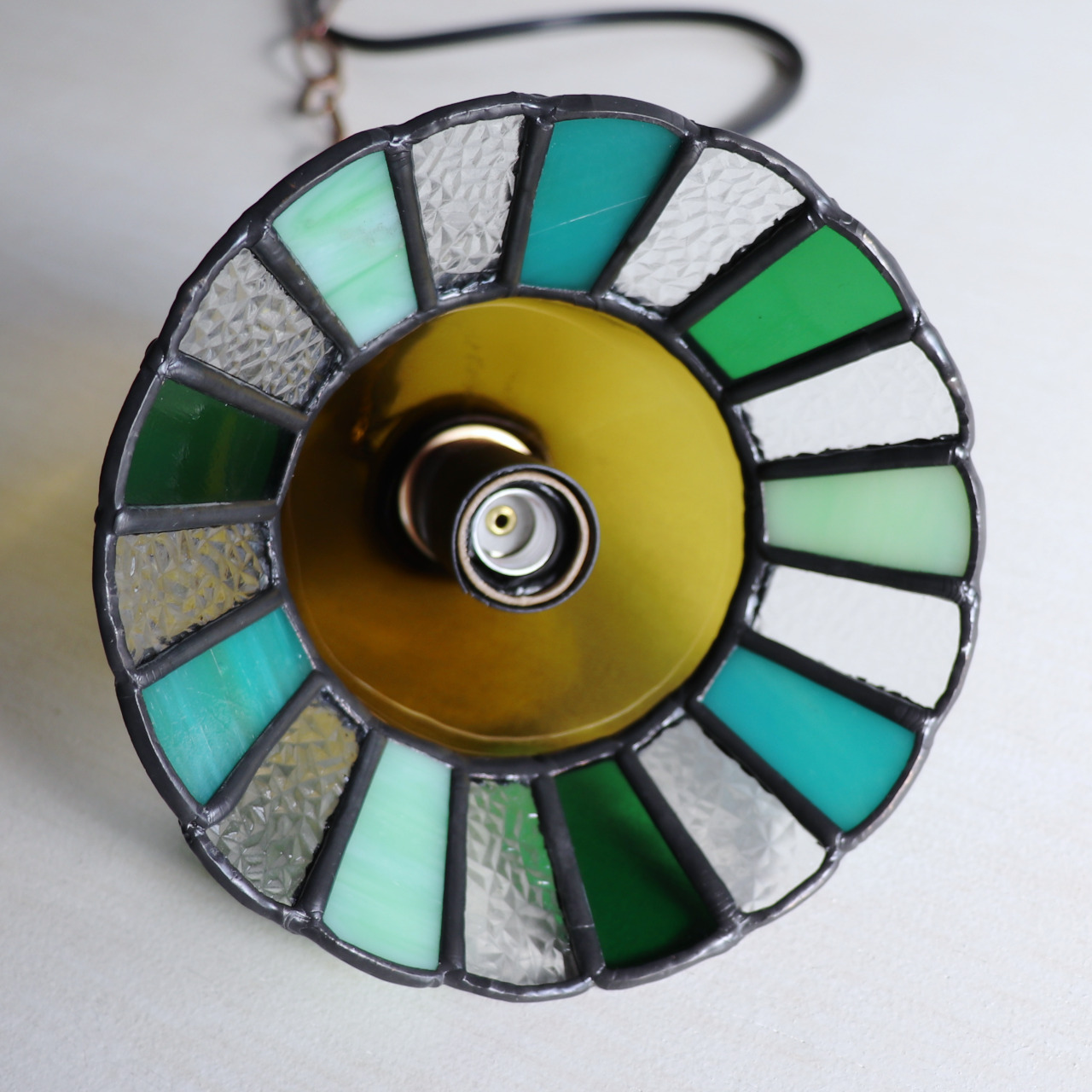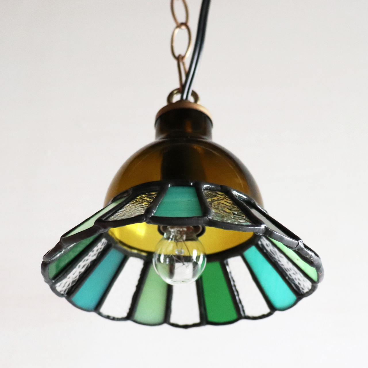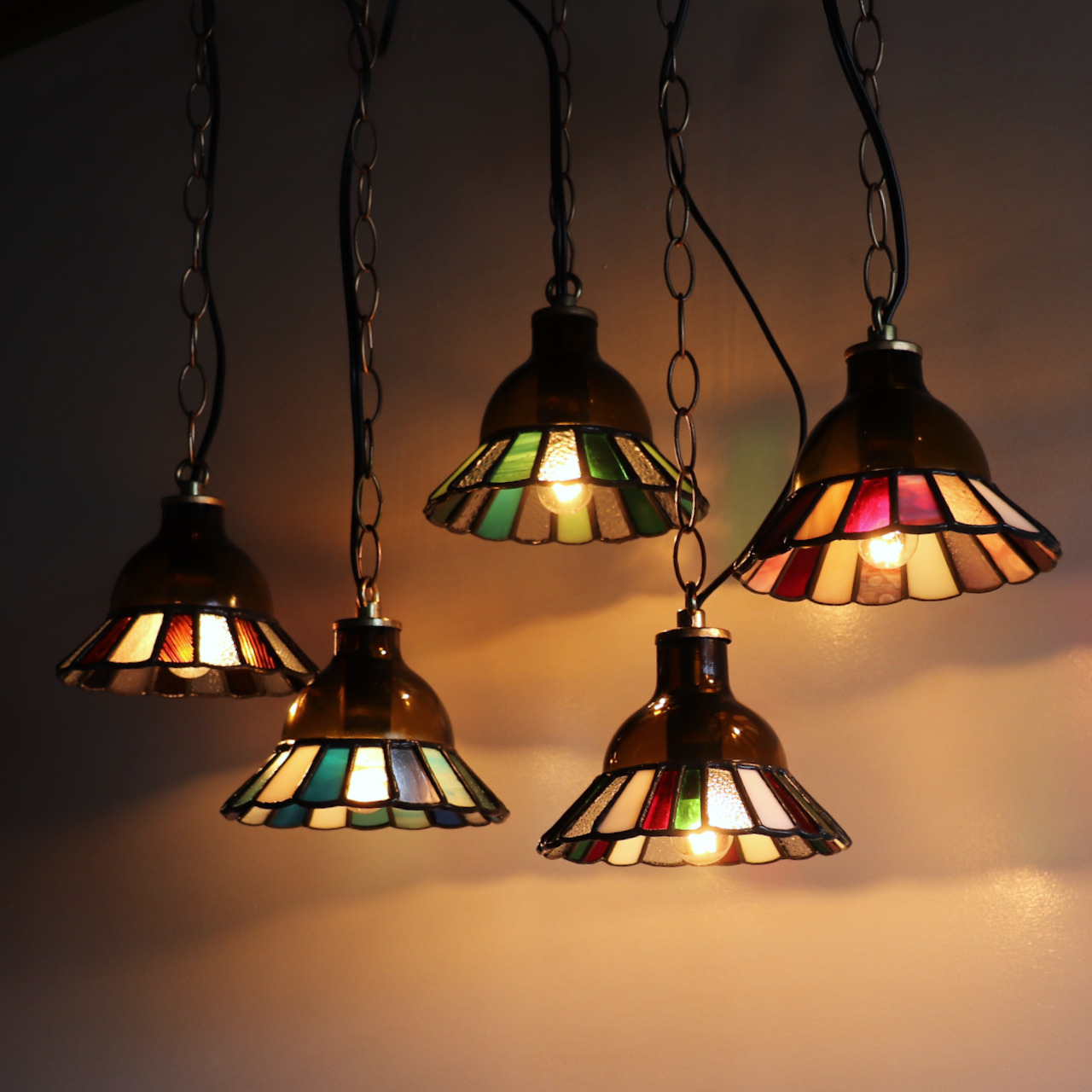 カットしたガラスピースを組み合わせてシェード(電傘)を作ることから、直線的なデザインになりがちなステンドグラス照明ですが、今回はドーム型のガラスと組み合わせてみました。