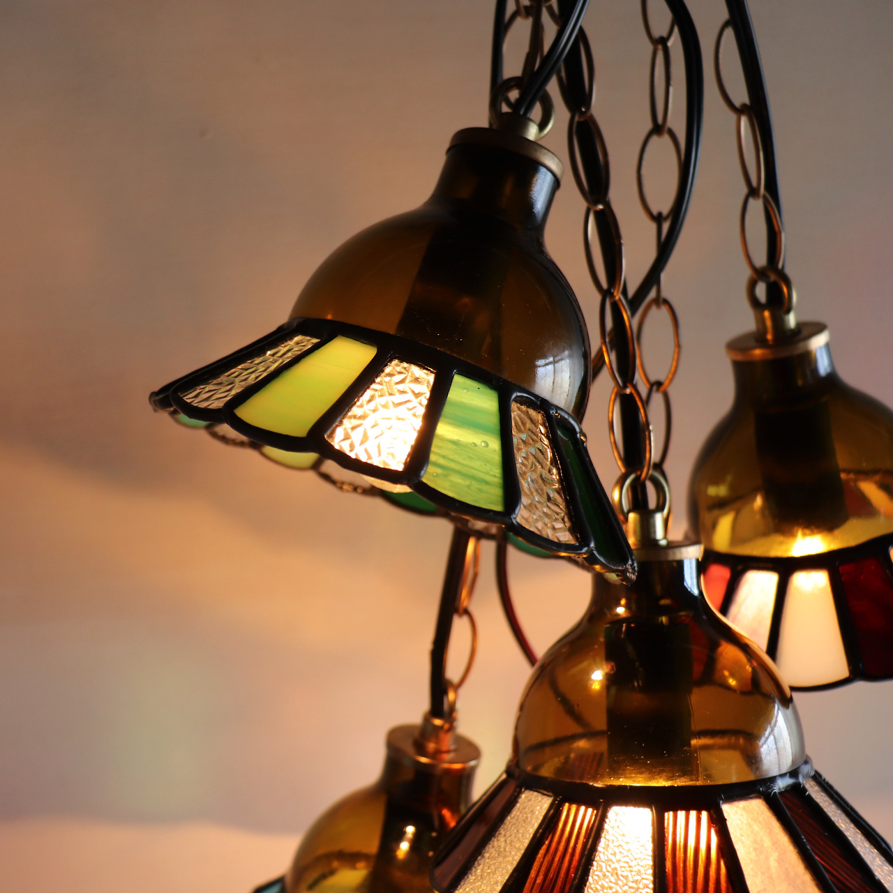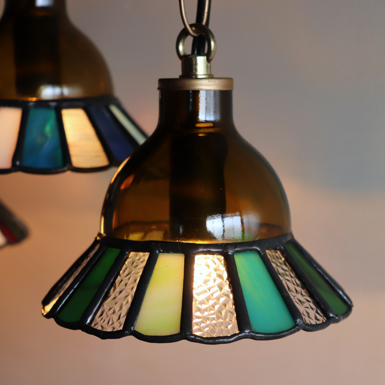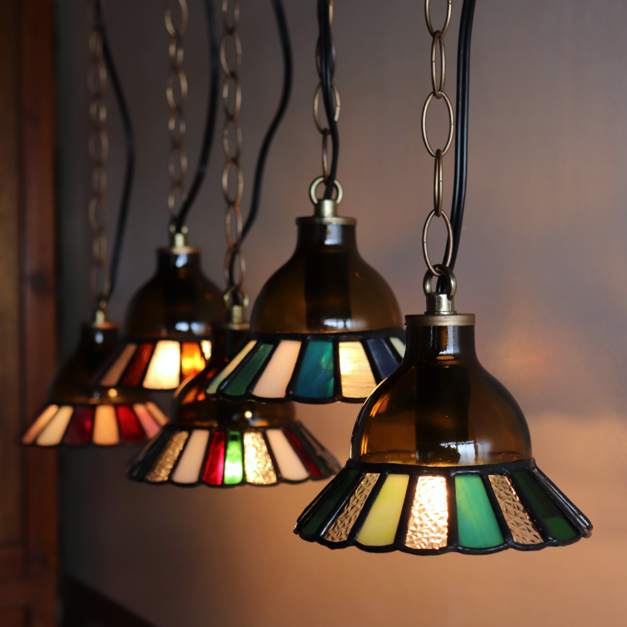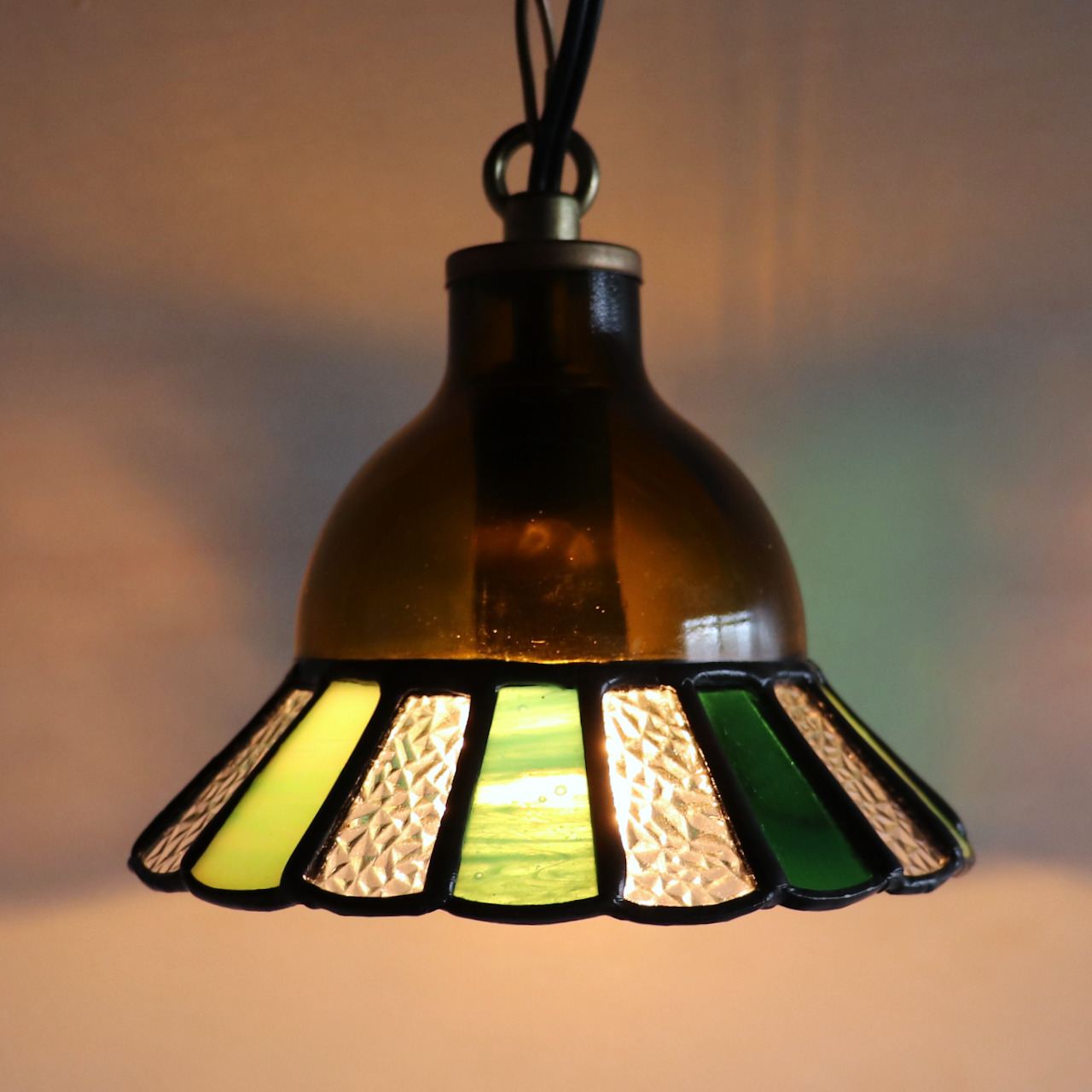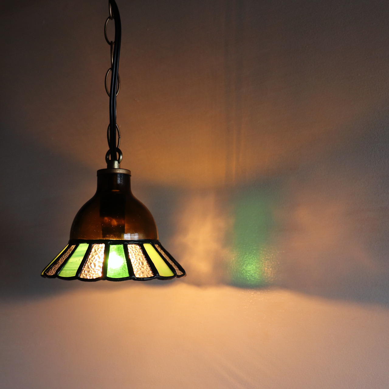 カットしたガラスピースを組み合わせてシェード(電傘)を作ることから、直線的なデザインになりがちなステンドグラス照明ですが、今回はドーム型のガラスと組み合わせてみました。