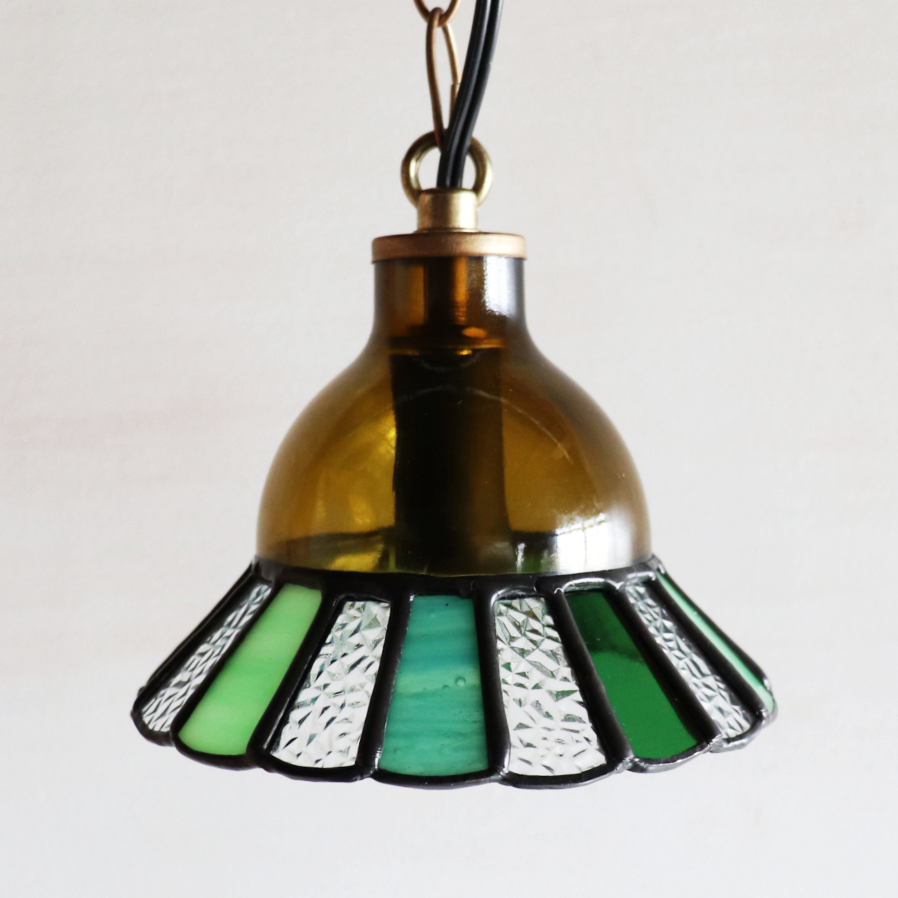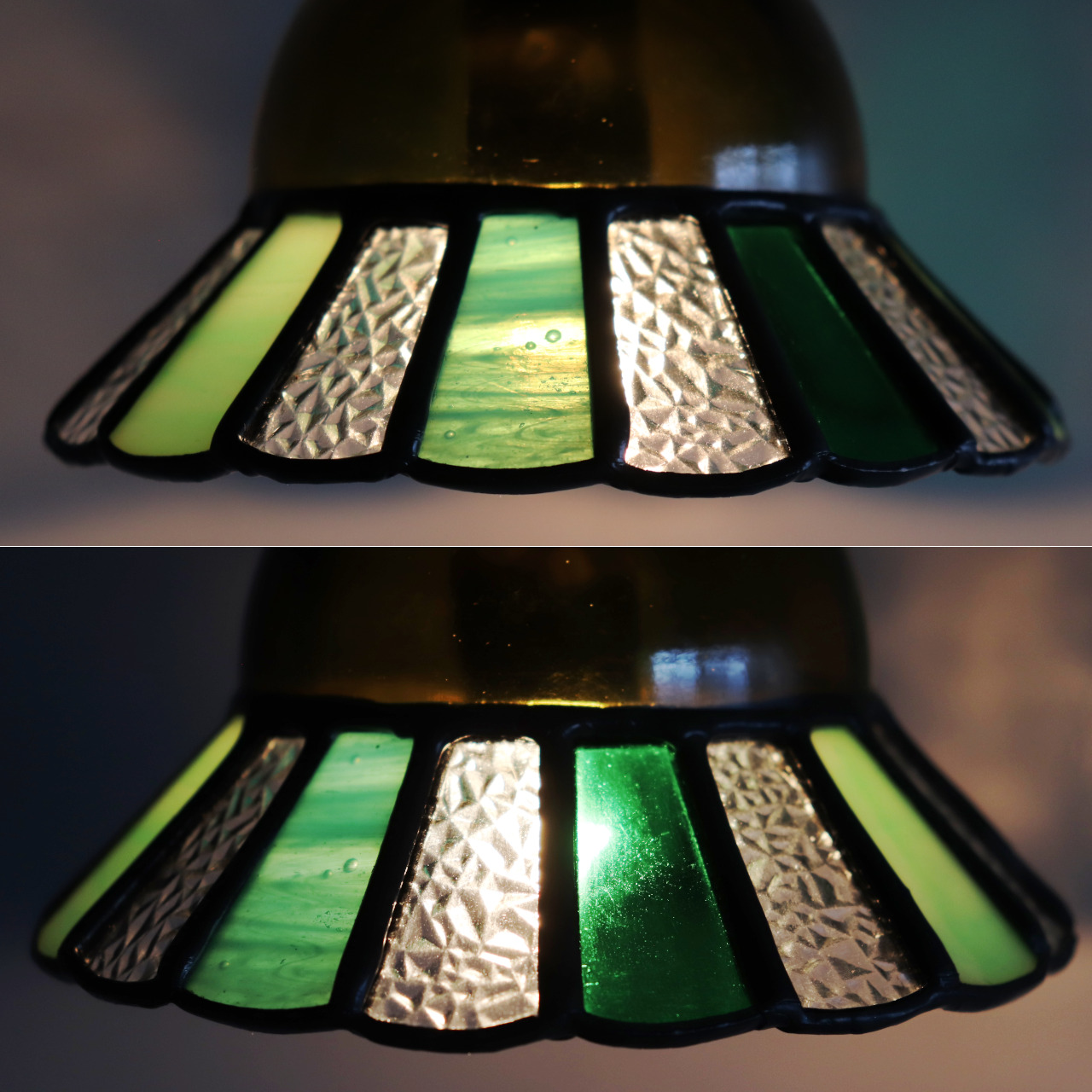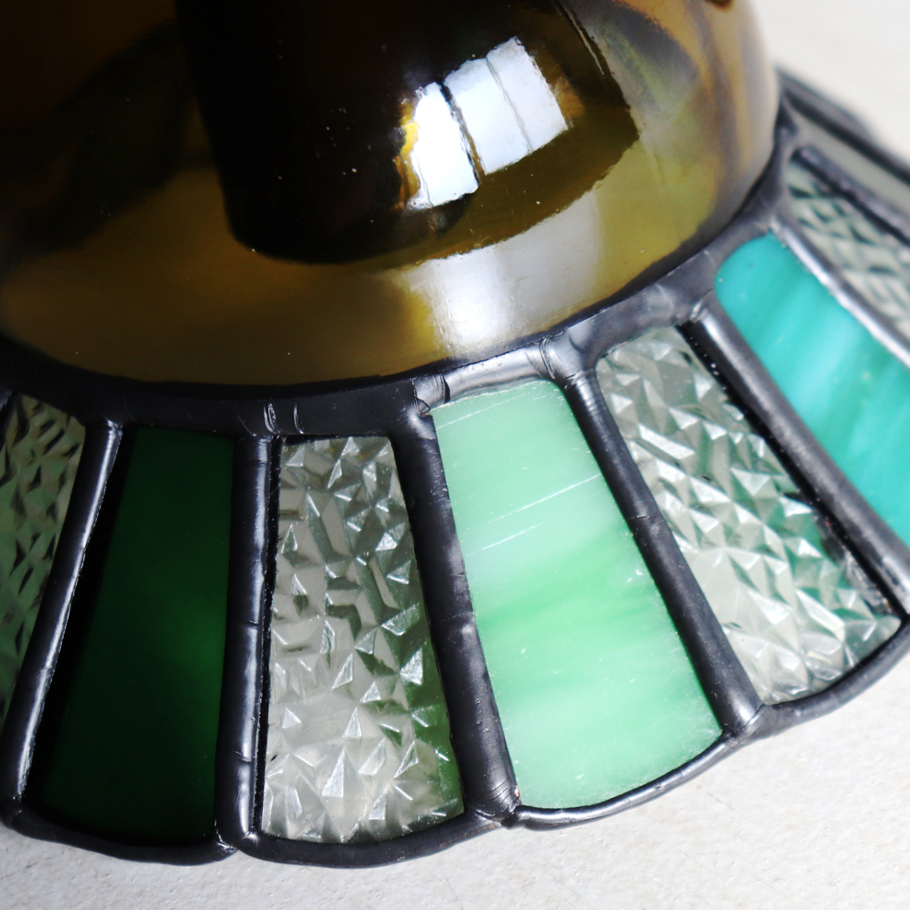 美しいマーブル模様のグリーンガラスや深いグリーンガラスを花びらのようにカットし、深いグリーンガラスのドーム先端に取り付けたことでお花のような可愛らしい形状に仕上がりました。