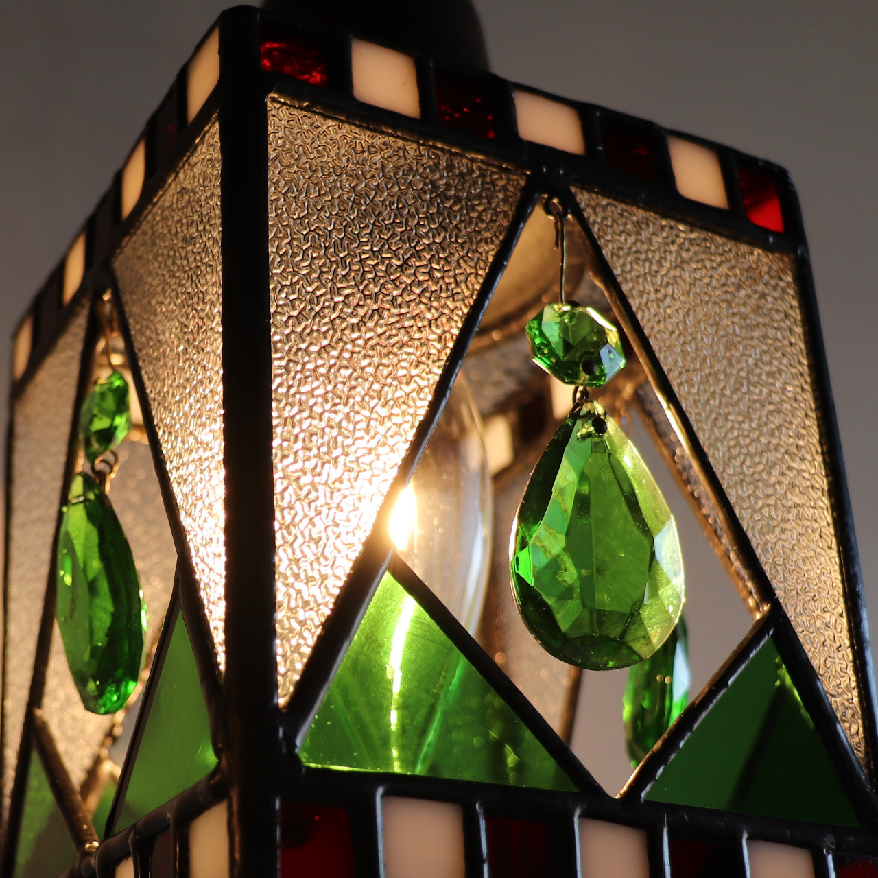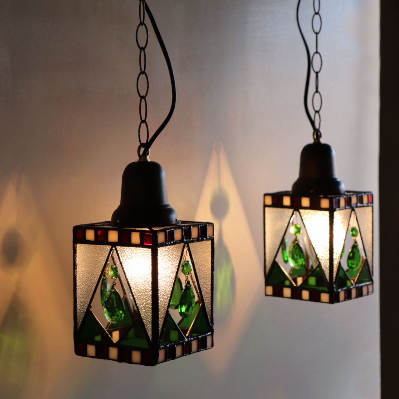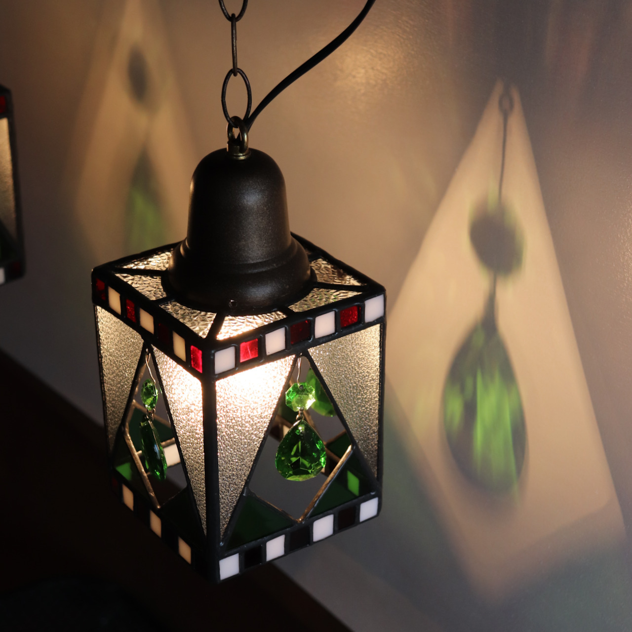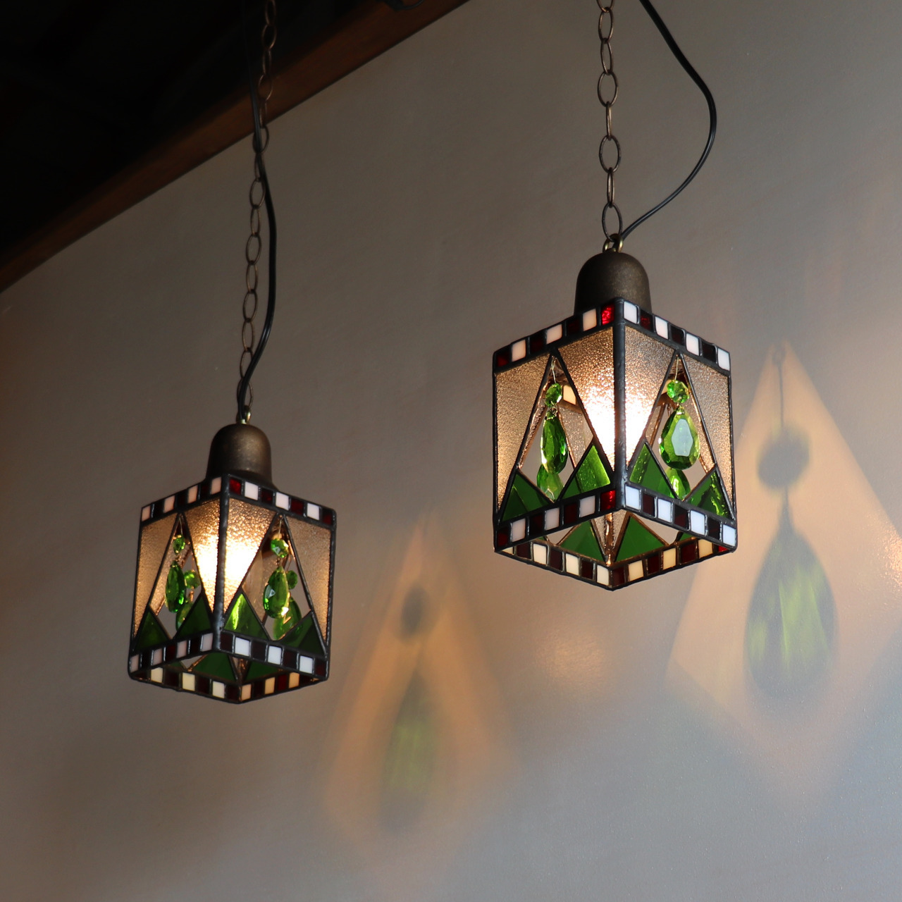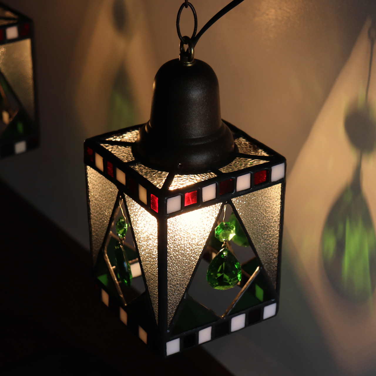 クリスマスカラー&ヴィンテージプリズムのステンドグラスペンダントライト|天井吊り下げ照明 [WPL-25-010]