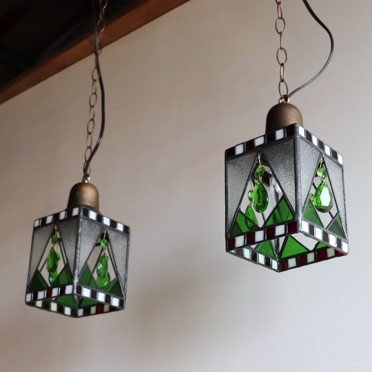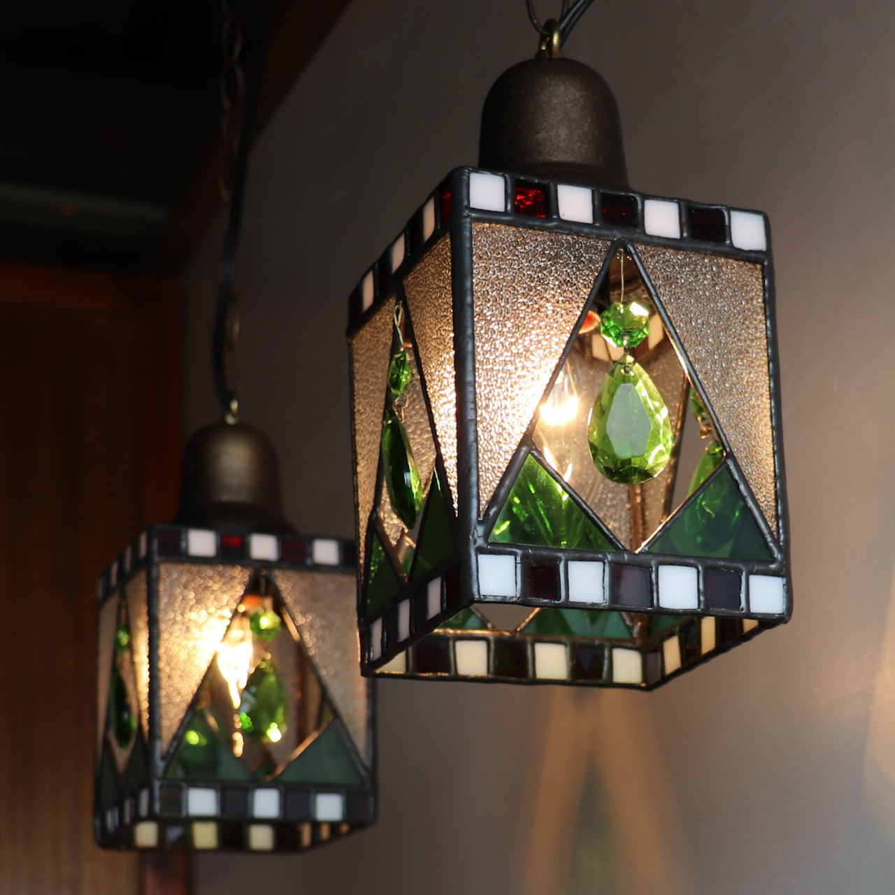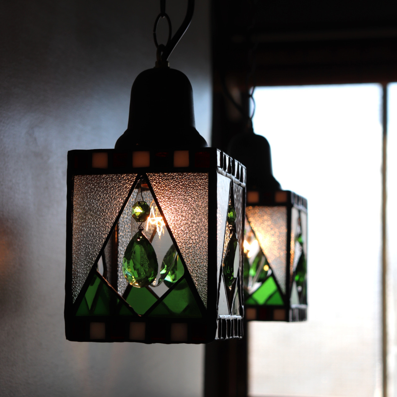 明るいグリーンの色ガラスに合わせ、ペンダントライトの4面には可愛らしいグリーンのヴィンテージシャンデリアパーツを取り付けました。ティアドロップと呼ばれる涙型のプリズムと、オクタゴンと呼ばれる八角形のプリズムがゆらゆらと揺れ華やかさをいっそう感じさせます。