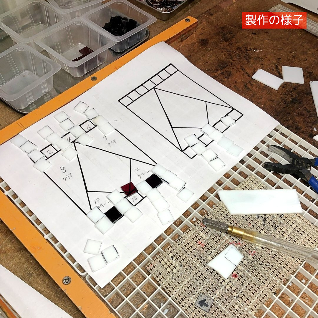クリスマスを彩る赤、緑、白の色ガラスを使って製作しました。