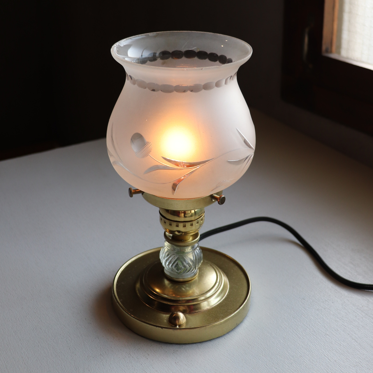 ヴィンテージのガラスシェードを使用した、すずらんモチーフのテーブルランプ。アンティークのような佇まいと一点物ならではの存在感を兼ね備えた卓上照明です。